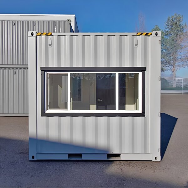 10ft x 10ft High Cube Mobile Office Container Key Features High Cube Design (10ft Height): Extra headroom for a spacious, comfortable interior. Insulated Personnel Door: Secure steel door with hardware, lockbox, and weatherproof finish. Windows: 1 × 5′ × 3′ Window 1 × 7′ × 3′ Window 1 × 2.5′ × 3′ Window Provides ample natural light and ventilation.