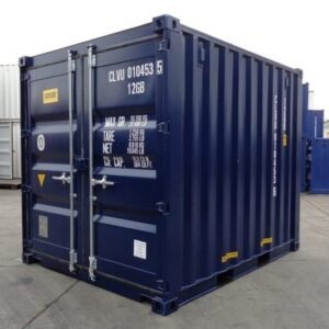 NEW 10FT SHIPPING CONTAINER (BLUE) INFORMATION NEW – One Trip Only CSC plated (gross weight) max: 10.1 tonnes All Cor-Ten Steel construction Exterior hinged double doors at end Two locking bars on EACH door Factory fitted lockbox 2 x forklift pockets on each side 28mm Marine Plywood floor on steel cross members Min 2 Vents per container