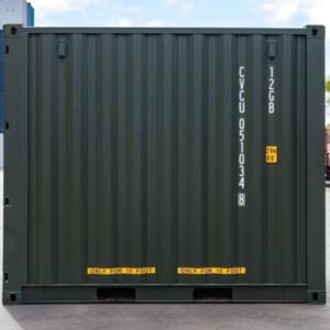 10Ft X 8Ft Shipping Container (One Trip) – Green FEATURES NEW – One Trip Only CSC plated (gross weight) max: 10.1 tones All Cor-Ten Steel construction Exterior hinged double doors at end Two locking bars on EACH door Factory fitted lockbox 2 x forklift pockets on each side 28mm Marine Plywood floor on steel cross members Min 2 Vents per container