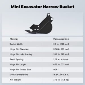 Upgrade your mini excavator with this Williams Tractors 200mm Narrow Bucket Attachment 8″ Bucket for Mini Excavator, designed for precise digging and trenching in confined spaces. Engineered with accurate dimensions, this trenching bucket delivers reliable compatibility with Williams Tractors mini excavators and many other models. It includes two hinge pins and nuts for quick, straightforward installation, helping reduce downtime on the job. Constructed from heavy-duty manganese steel, this bucket offers excellent wear and corrosion resistance, making it dependable for demanding work environments. Ideal for construction, landscaping, demolition, and more, this mini excavator narrow bucket boosts productivity and performance helping you complete jobs faster and more efficiently.