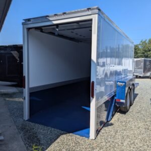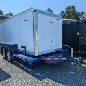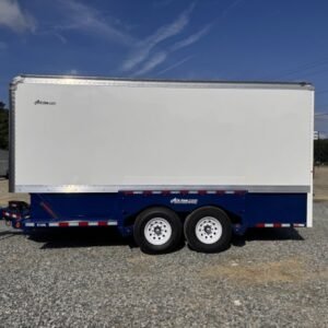 This E16 XL with 75″ inside width x 15’10” long inside box drop deck enclosed trailer from Air Tow has tandem axles with a rubber suspension, electric brakes, and spare tire and spare tire mount. These units come standard with: