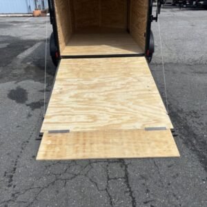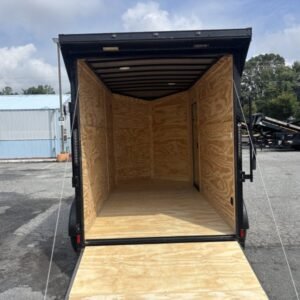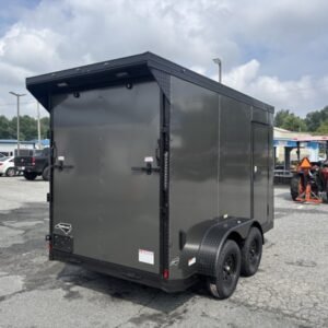 “This v-nose 6×12 enclosed cargo trailer has a single non-braking idler axle with a rating of 7,000 lb GVWR. This deluxe model has a side door, a rear ramp door, 0.030″” thick metal sides, a slant v-nose, rear wing with lights, blackout package (black rims, trim, ATP), and a 2000 lb jack.