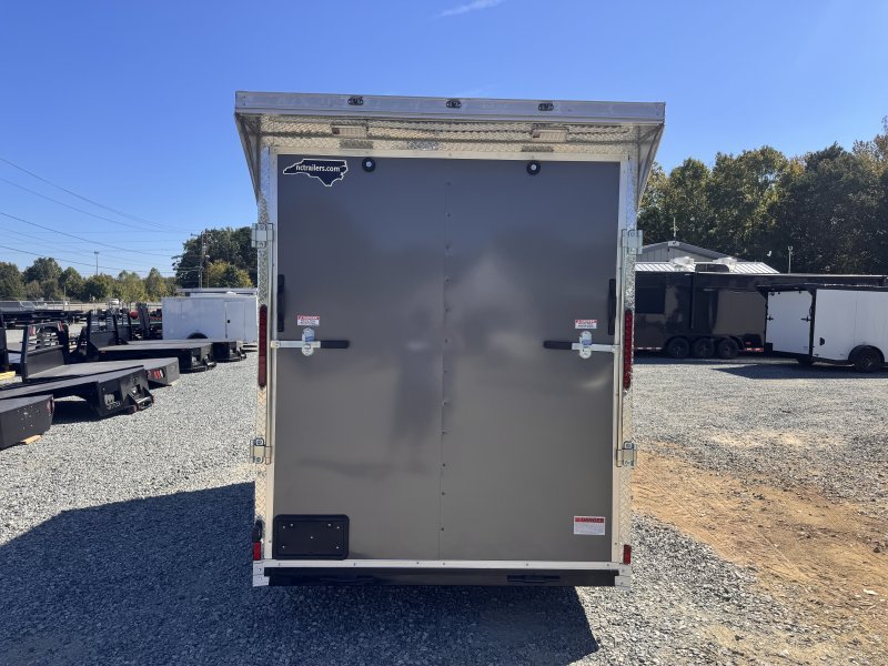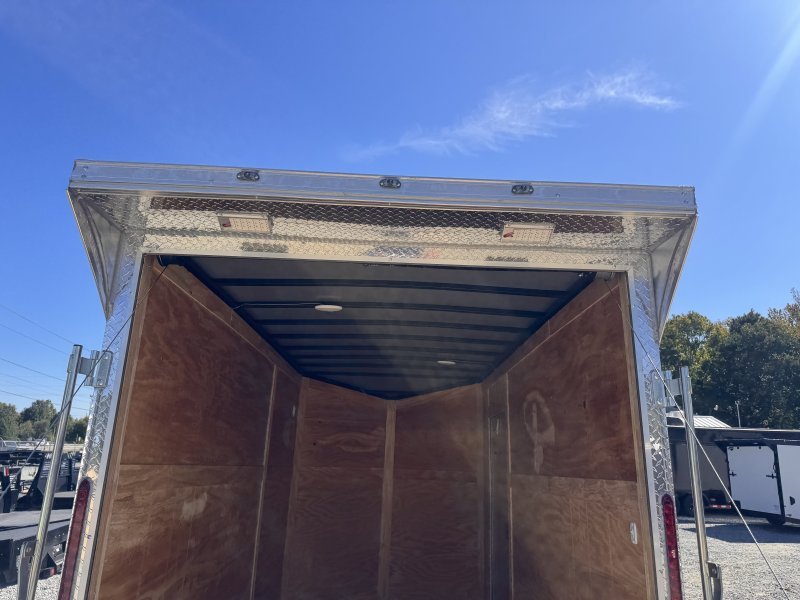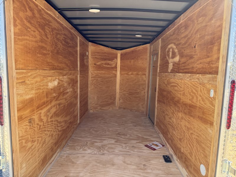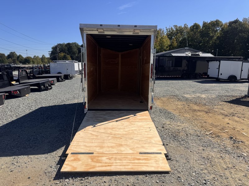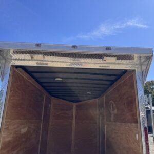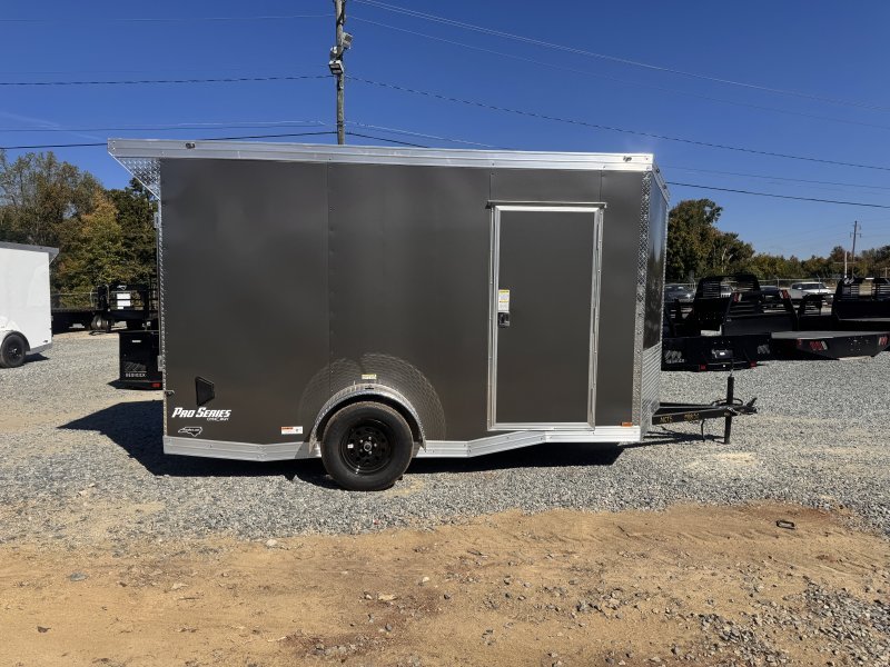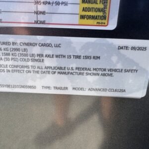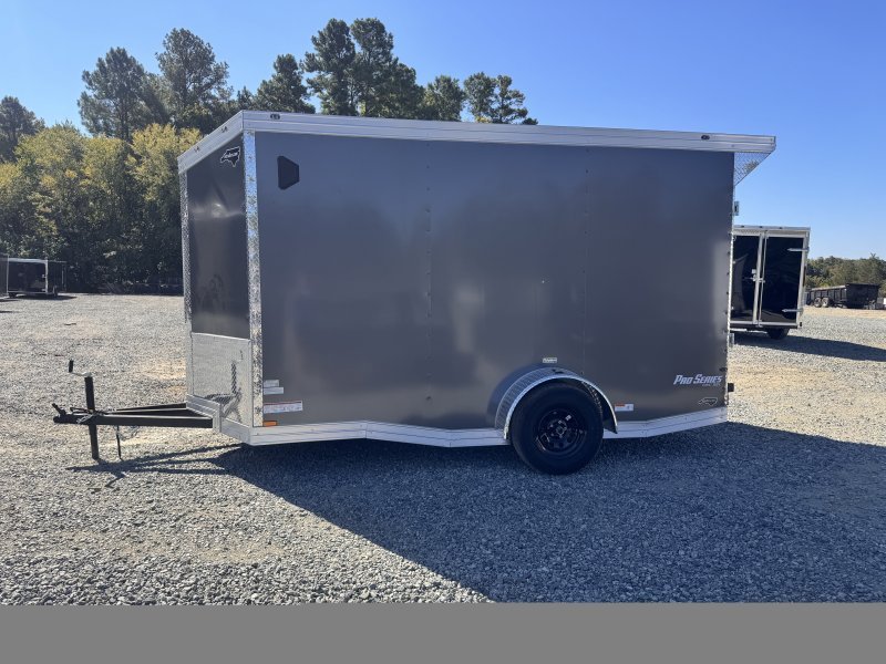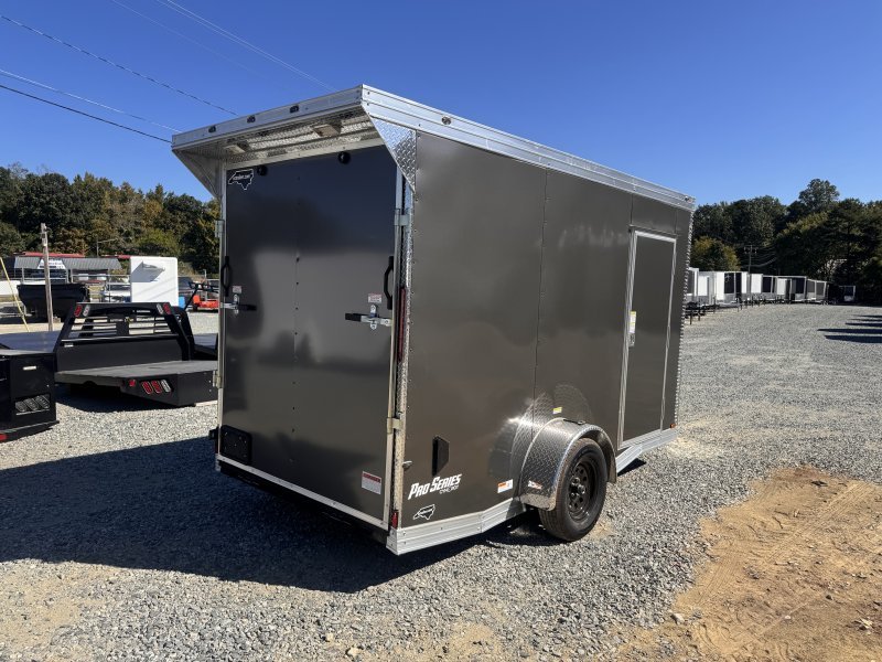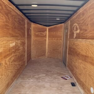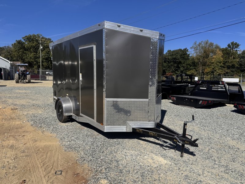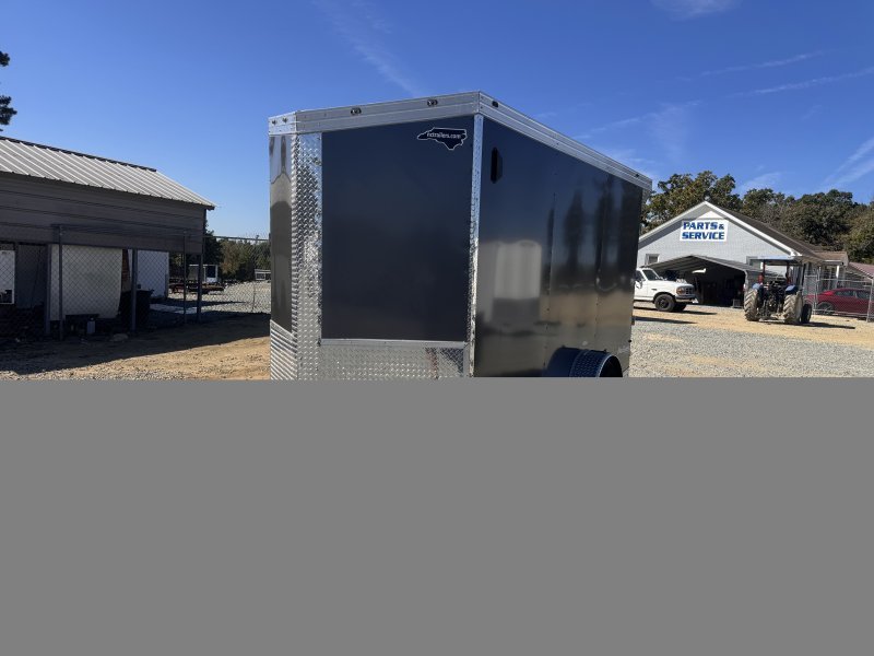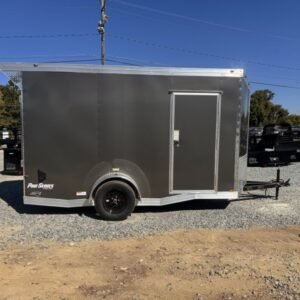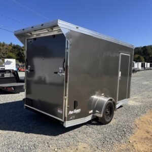 This v-nose 6×12 enclosed cargo trailer has a single non-braking idler axle with a rating of 2,990 lb GVWR. This deluxe model has a side door, a rear ramp door, 0.080″ thick metal sides, a slant v-nose, rear wing, and a 2000 lb jack.