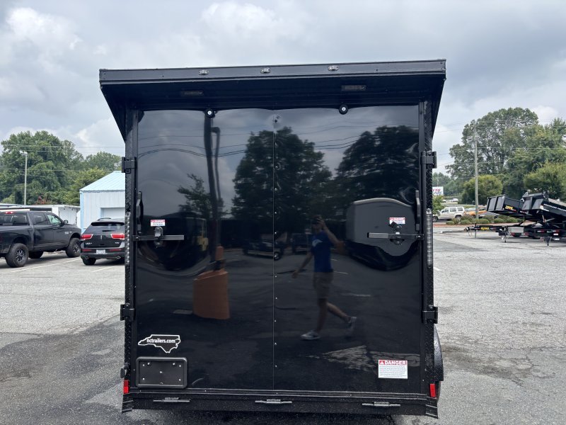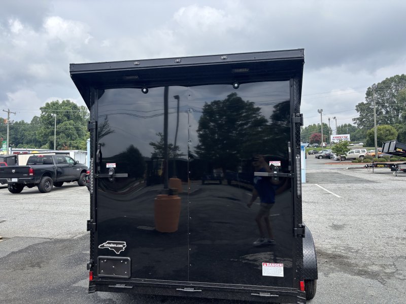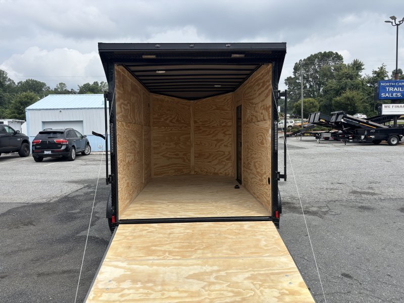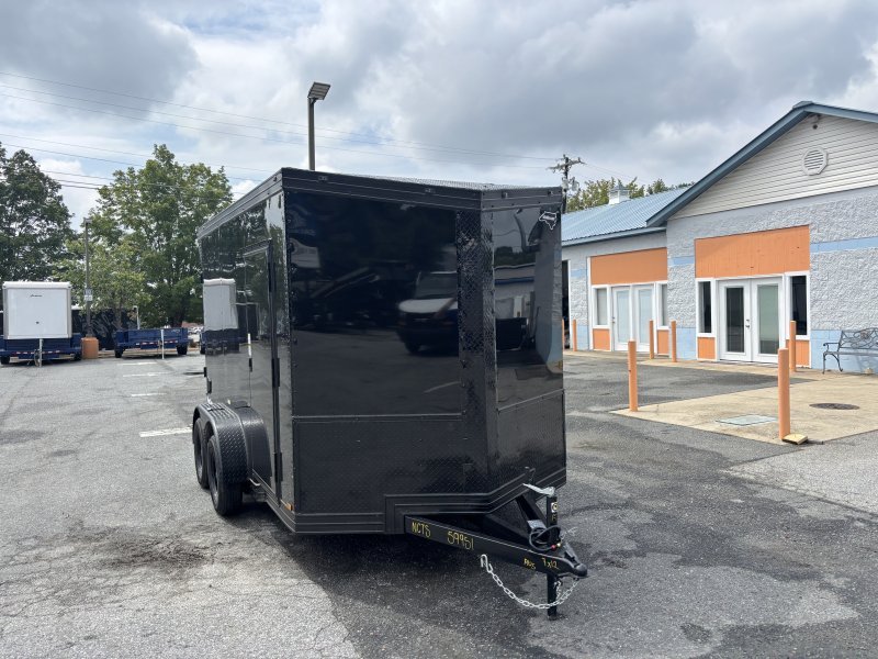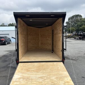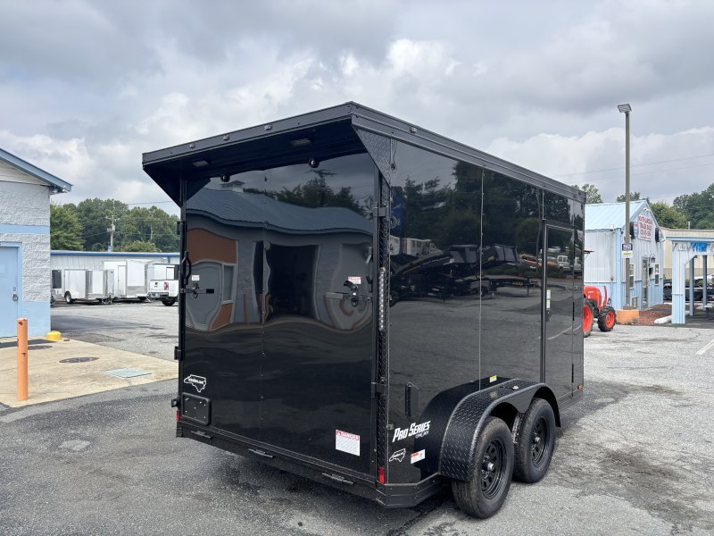 “This v-nose 7×12 enclosed cargo trailer has a single braking axle with a rating of 7,000 lb GVWR. This Pro Series model has a 7′ interior height, side door, a rear ramp door, 0.080″” polycore sides, a slant v-nose, rear wing, blackout package (black rims, trim, ATP), and a 2000 lb jack.
