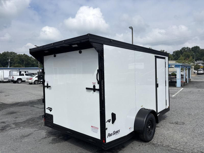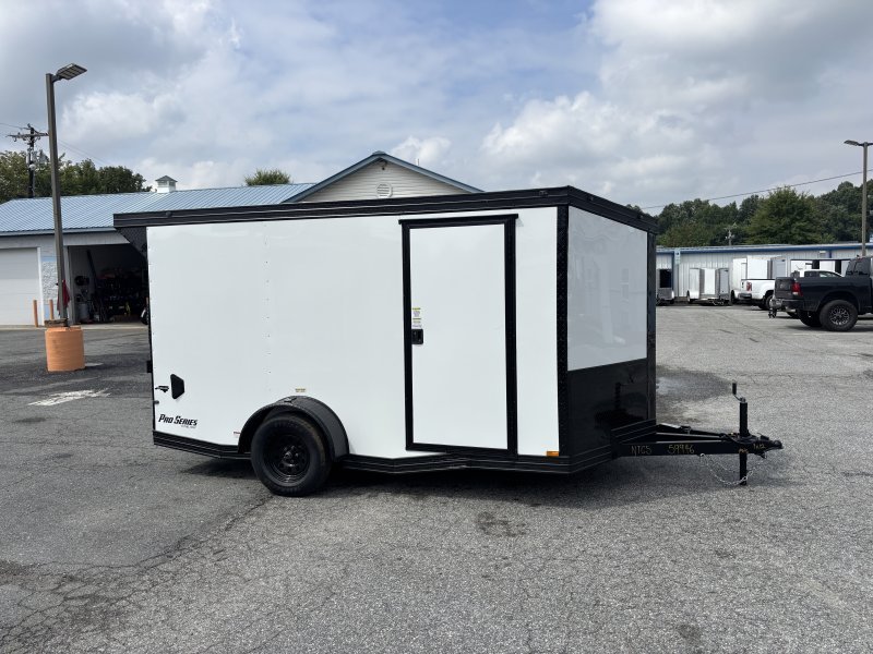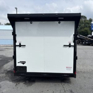“This v-nose 7×12 enclosed cargo trailer has a single braking axle with a rating of 3,500 lb GVWR. This Pro Series model has a 7′ interior height, rear ramp door, 0.080″” polycore sides, a slant v-nose, rear wing with LED lights, and a 2000 lb jack.