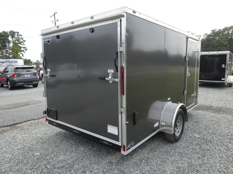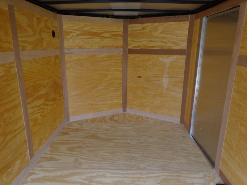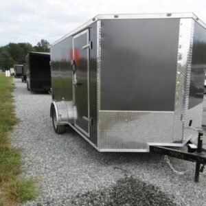 This v-nose 7×12 enclosed cargo trailer has 6’3″ interior height, a single braking axle with a rating of 2,990 lb GVWR. This type of trailer is ideal for light-duty or residential tasks. This model has a side door, a rear ramp door, and a 2000 lb jack.