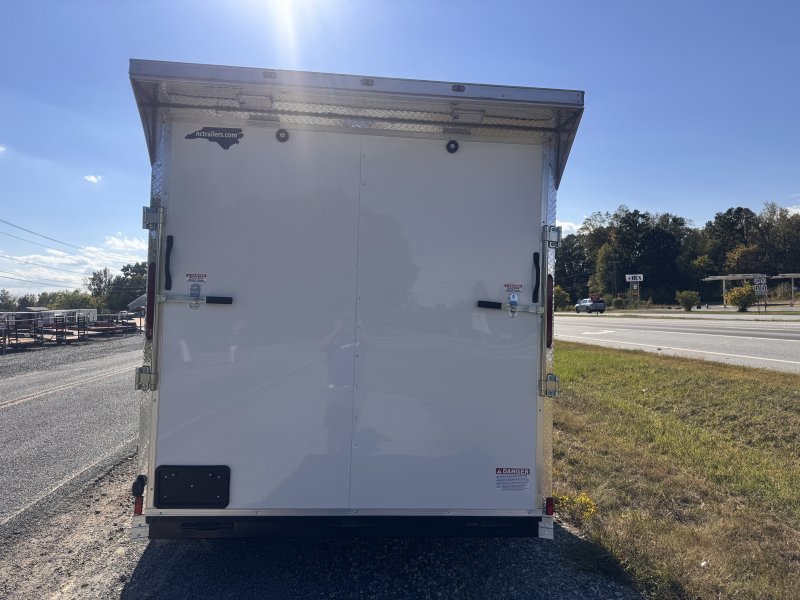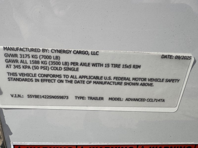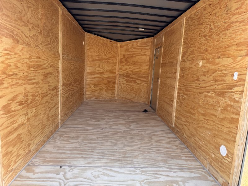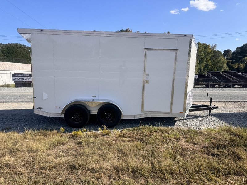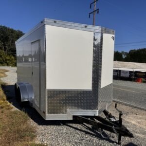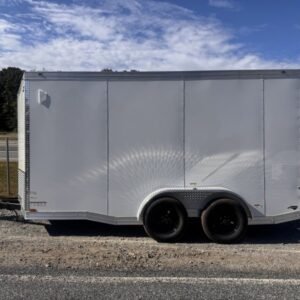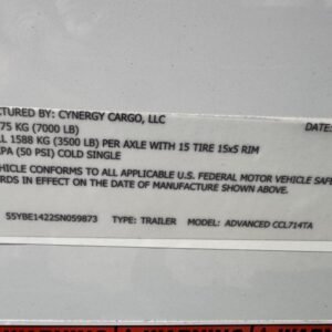 “This v-nose 7×14 enclosed cargo trailer has a 7′ interior height, tandem axles with brakes with a rating of 7,000 lb GVWR. This Pro Series model has a side door, a rear ramp door, 0.080″” polycore sides, a slant v-nose, rear wing, and a 2000 lb jack.