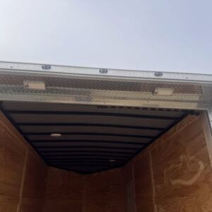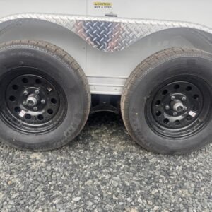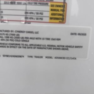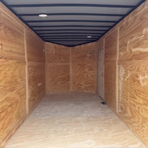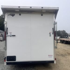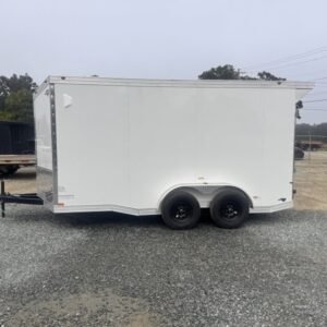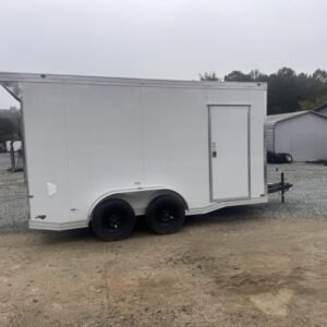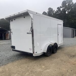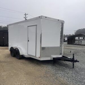 This v-nose 7×14 enclosed cargo trailer has a 7′ interior height, tandem axles with brakes with a rating of 7,000 lb GVWR. This Pro Series model has a side door, a rear ramp door, 0.080″ polycore sides, a slant v-nose, rear wing, and a 2000 lb jack.
