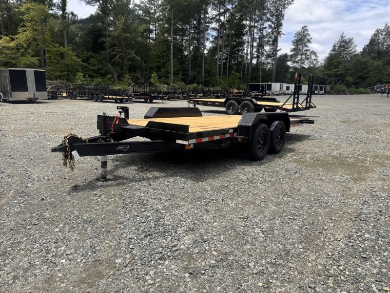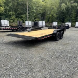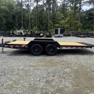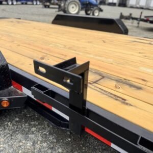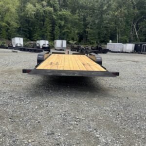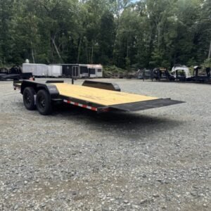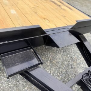 This standard equipment trailer comes with two 3,500 lb axles, 84″ wide deck (between the fenders), a dovetail, and fold-down ladder ramps.