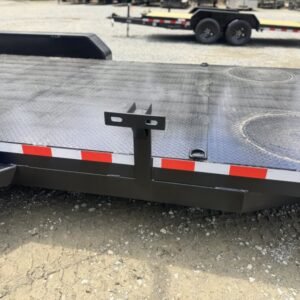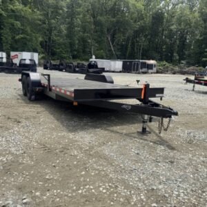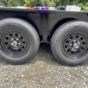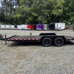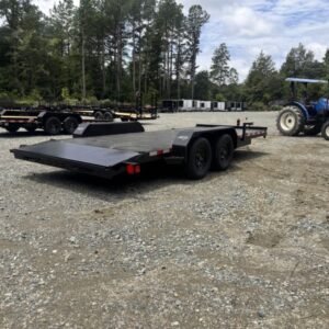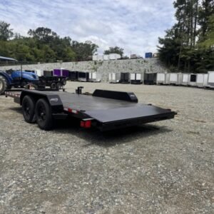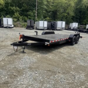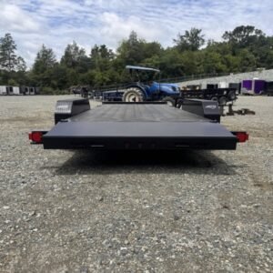 This deluxe 7,000 lb diamond plate steel floor single-car hauler measures 84-inch span between fenders with a 18-foot length. Standard features include a fixed 2 5/16″ A-frame coupler, four-wheel brakes, 205/75 R15 tires, 6 D-rings, a 4′ dovetail with rear slide-in loading ramps.