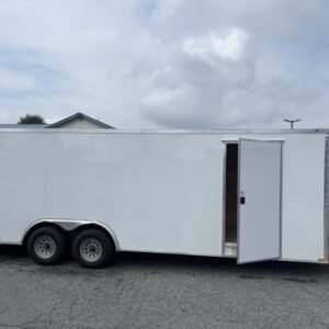“This v-nose 8.5×24 enclosed cargo trailer has a 6’6″” interior height, tandem axles with brakes with a rating of 10,000 lb GVWR. This type of trailer is ideal for light-duty or residential tasks. This model has a side door, a rear ramp door, and a 2000 lb jack.