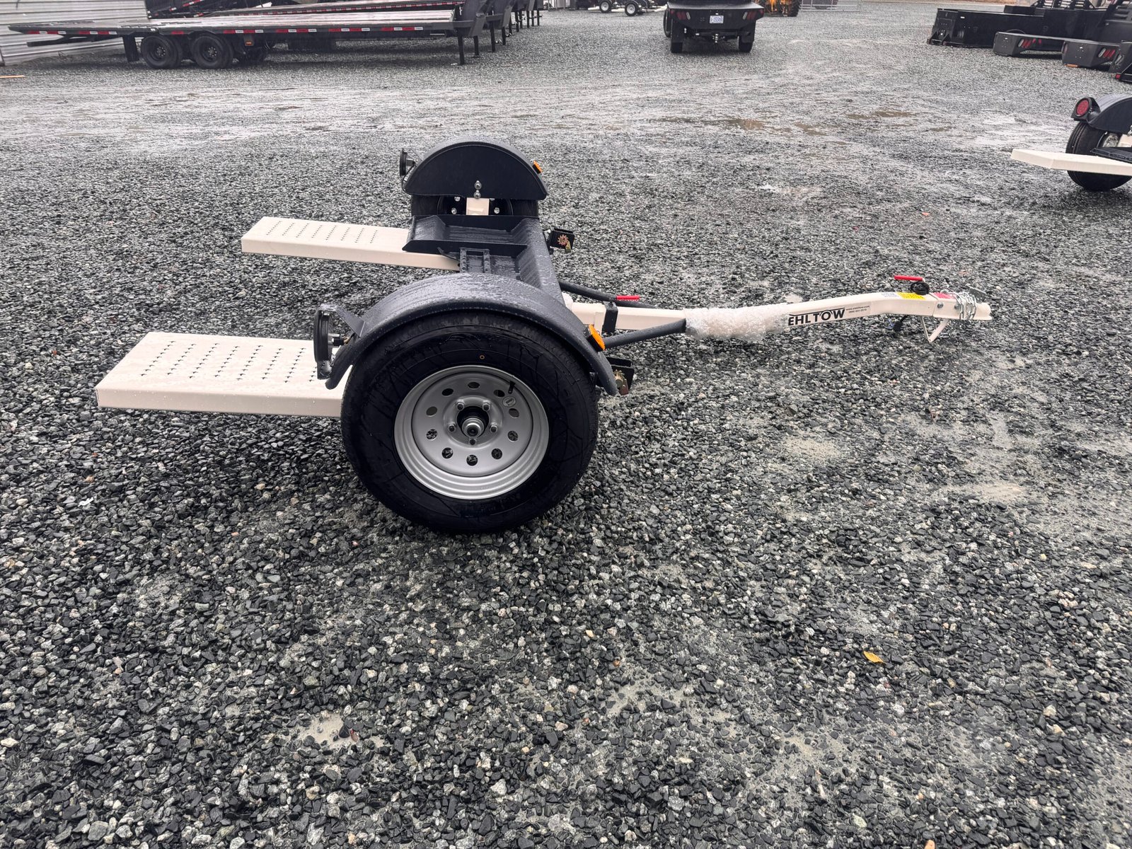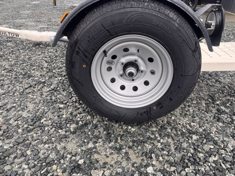 This Stehl Tow single-car tow dolly has a single non-braking axle with a rating of 2,990 lb GVWR. This model has 7,000 lb lashing winches, dual safety chains, and two 13″ extra heavy duty 8 ply tires.