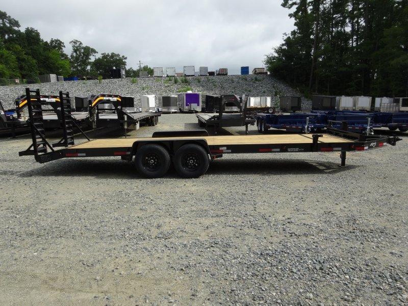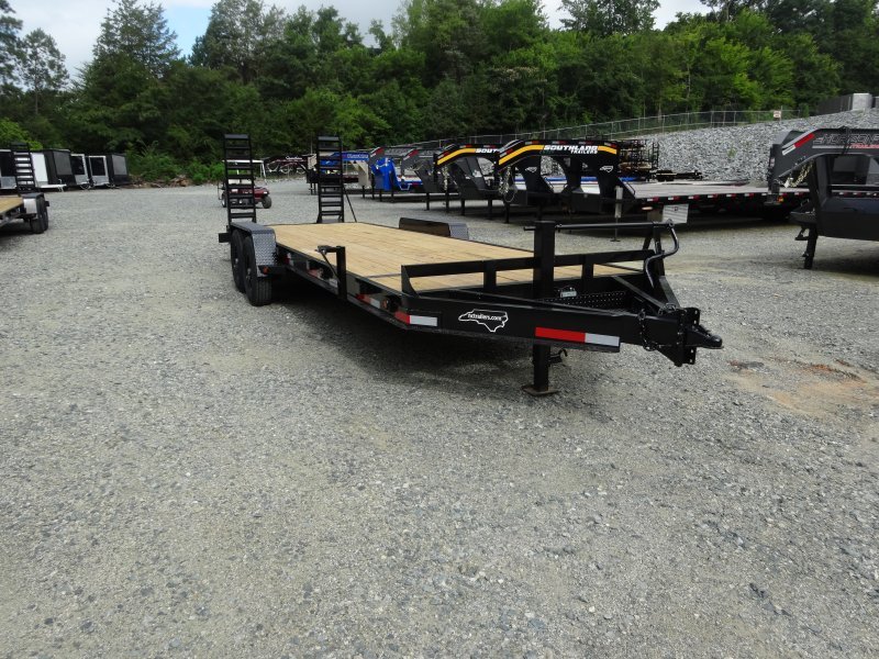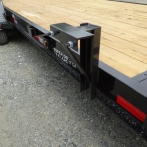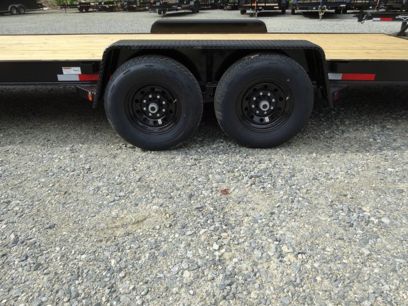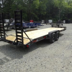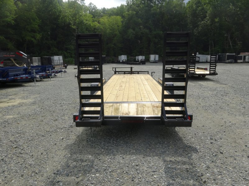 This standard equipment trailer comes with two 7,000 lb axles, 78″ wide deck (between the fenders), a dovetail, and fold-down ladder ramps.