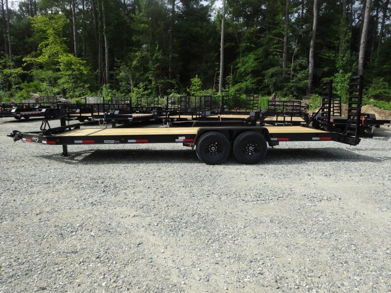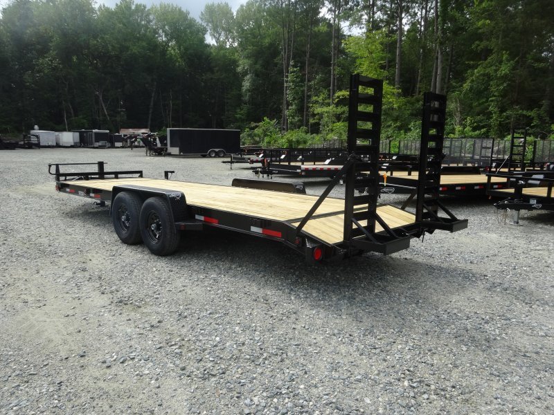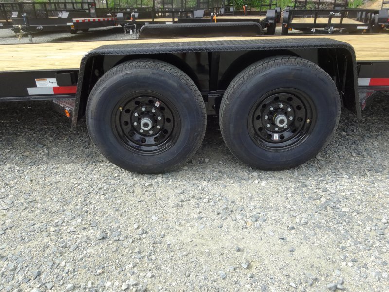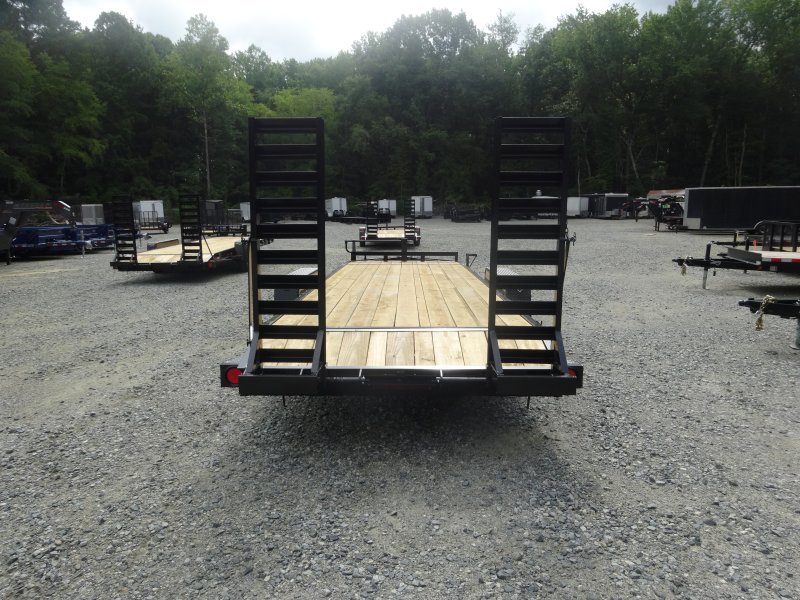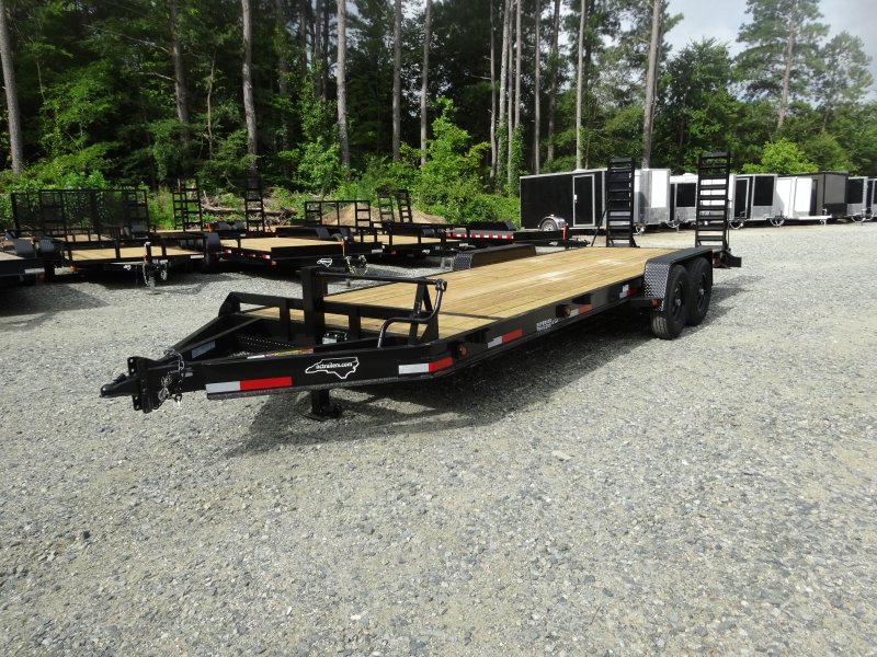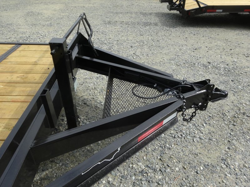 This standard equipment trailer comes with two 7,000 lb axles, 78″ wide deck (between the fenders), a dovetail, and fold-down ladder ramps.