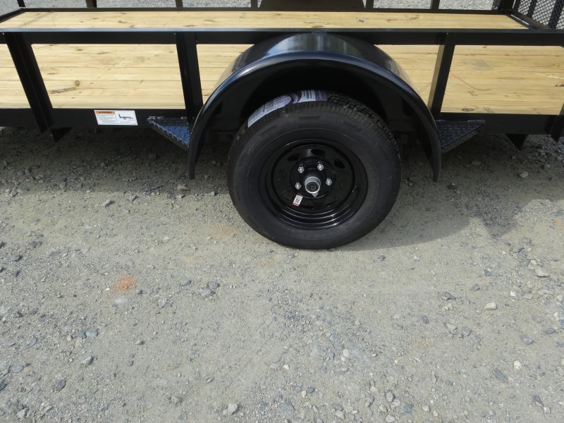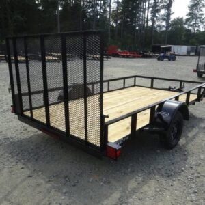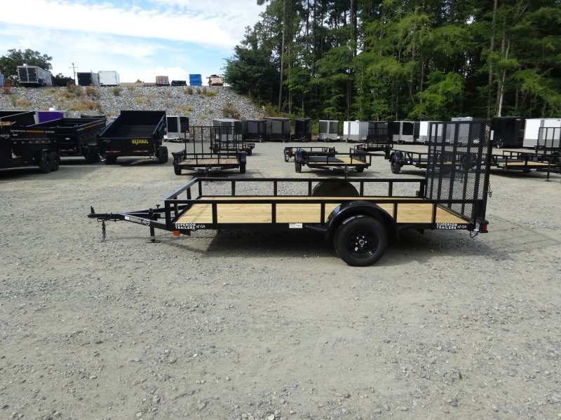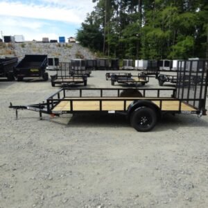 “This standard 12-foot length utility/landscape trailer has a 72″” width ideal for home and garden tasks. GVWR rating of 3000 lb. This trailer features a top rail, 48″” heavy-duty landscape gate, one 3,500 lb Idler axle, and a LED lighting package as well as a 5-lug spare tire mount.
