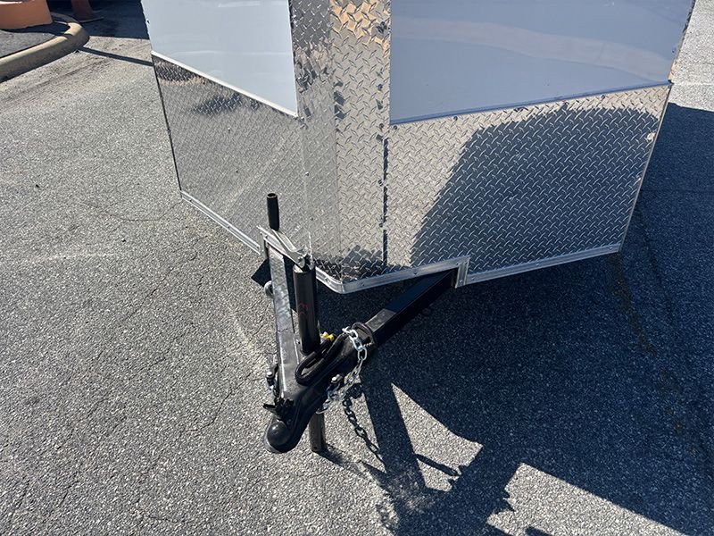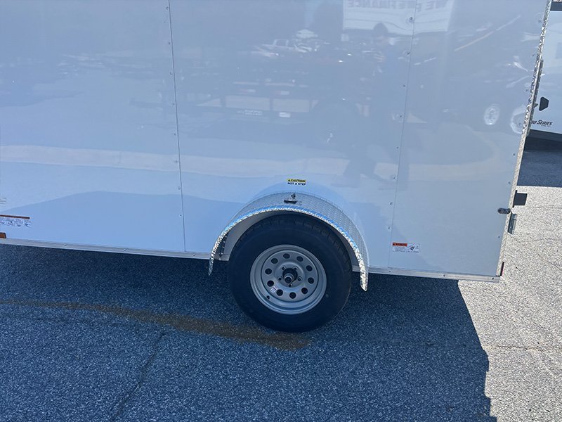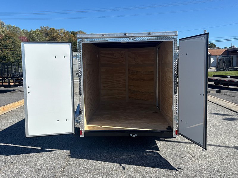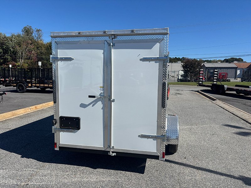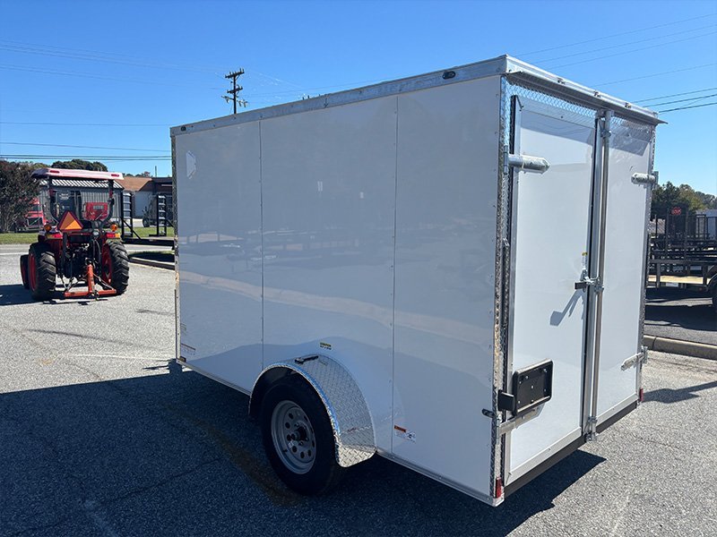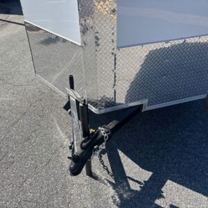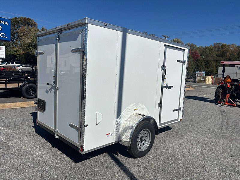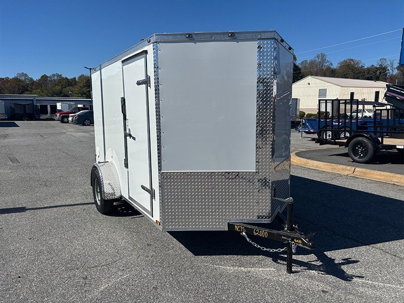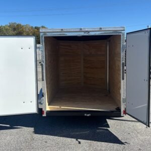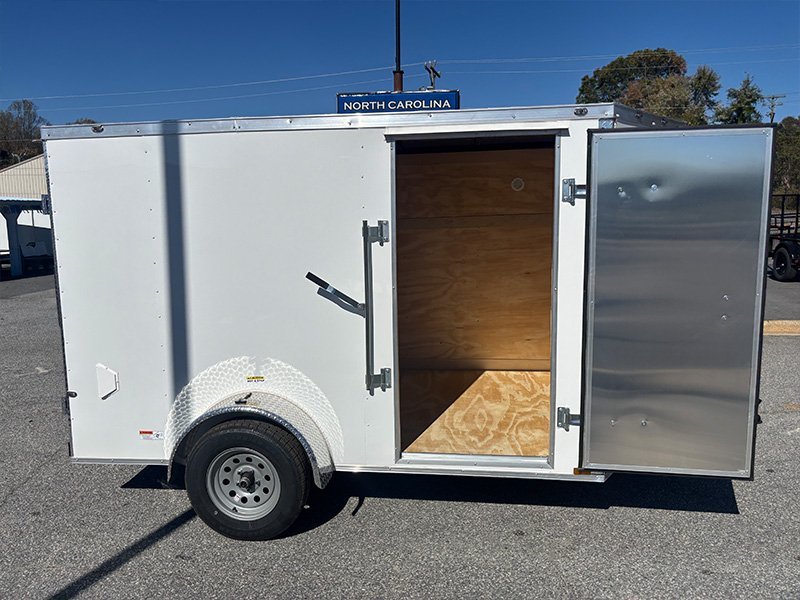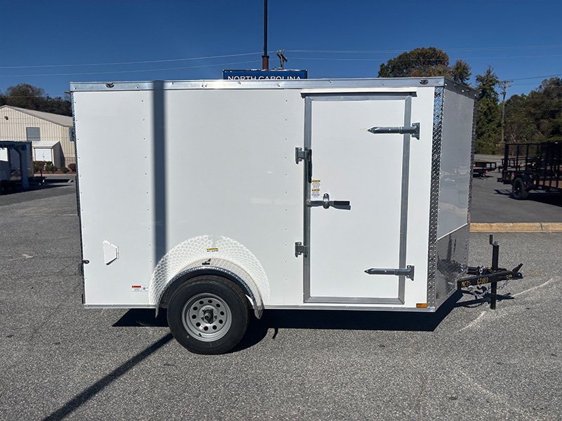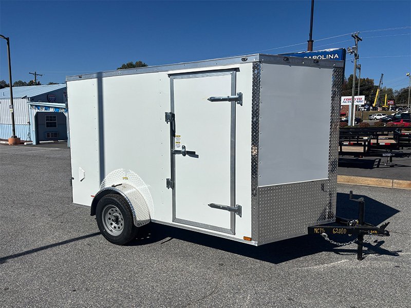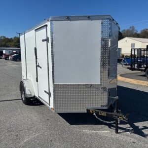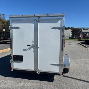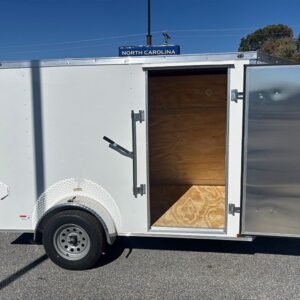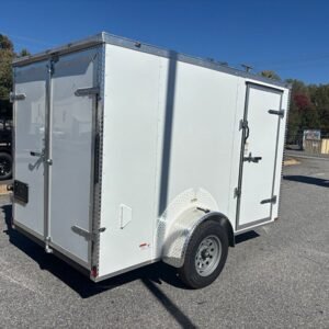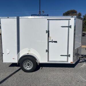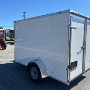 “This v-nose 6×10 enclosed cargo trailer has a single non-braking idler axle with a rating of 2,990 lb GVWR. This type of trailer is ideal for light-duty or residential tasks. This model has a side door, a rear barn door, and a 2000 lb jack.