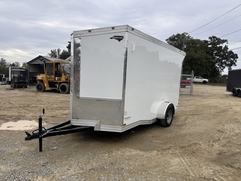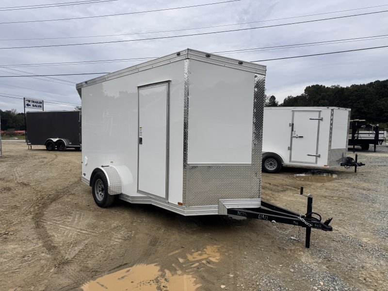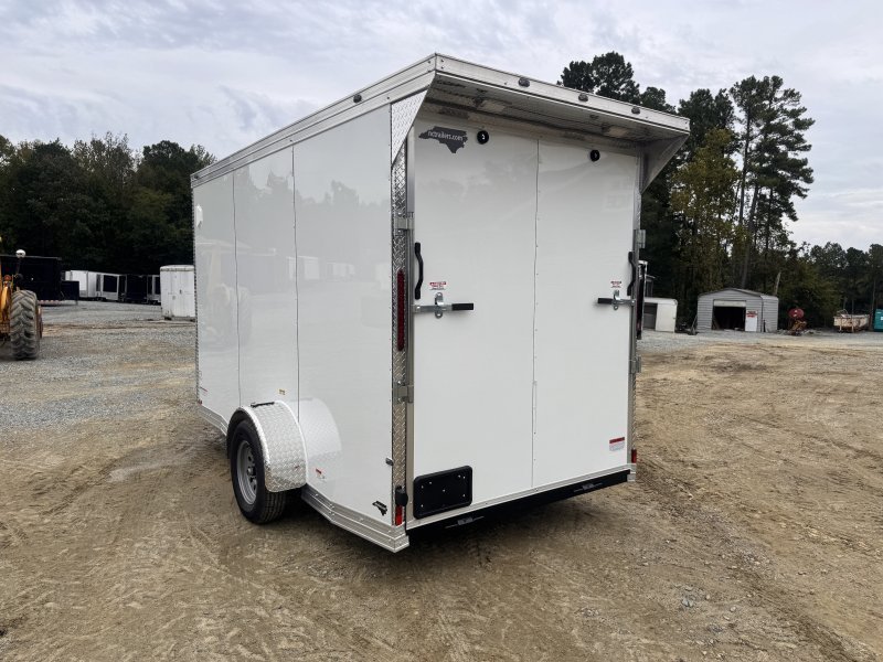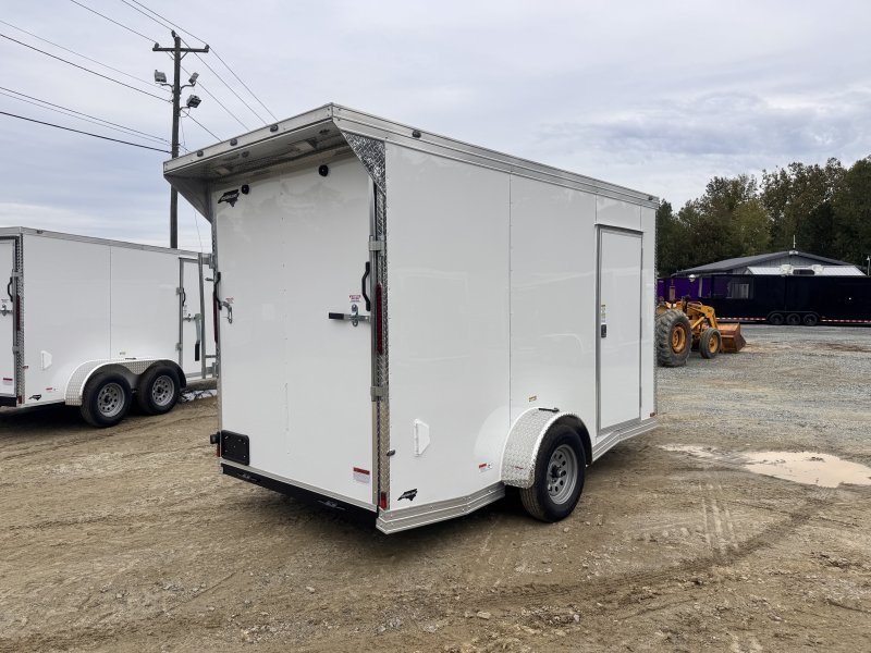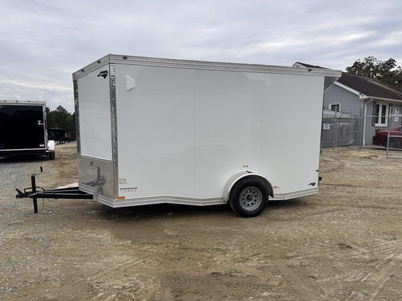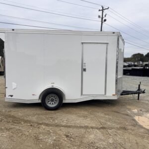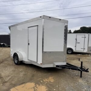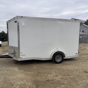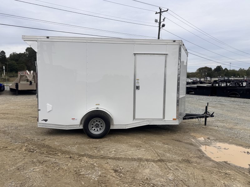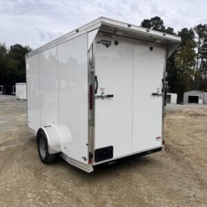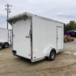 “This v-nose 6×12 enclosed cargo trailer has a single non-braking idler axle with a rating of 2,990 lb GVWR. This Pro Series model has a side door, a rear extended ramp door, 0.080″” polycore sides, 7′ interior height, a slant v-nose, rear wing with LED lights, and a 2000 lb jack.