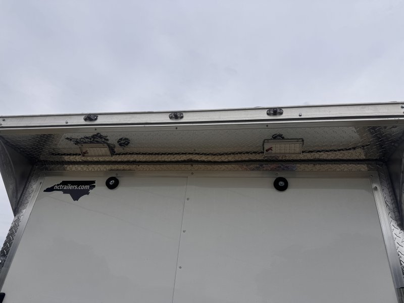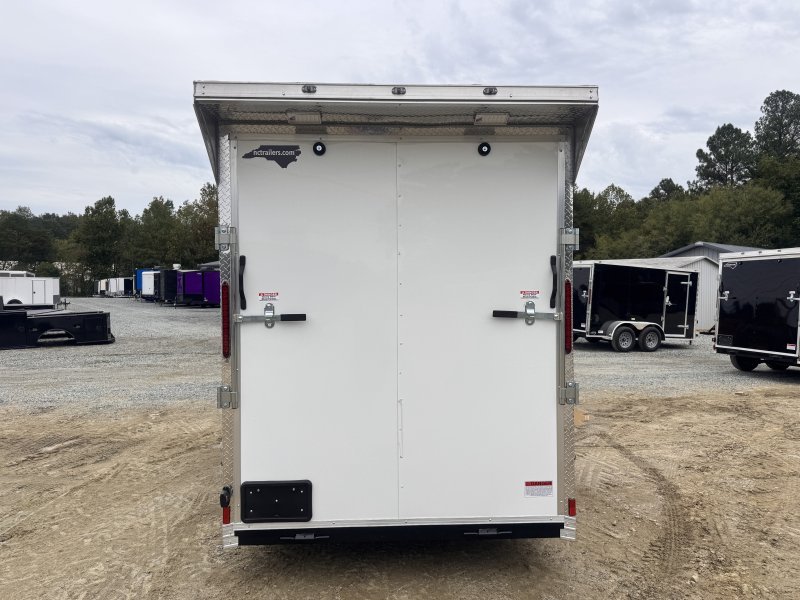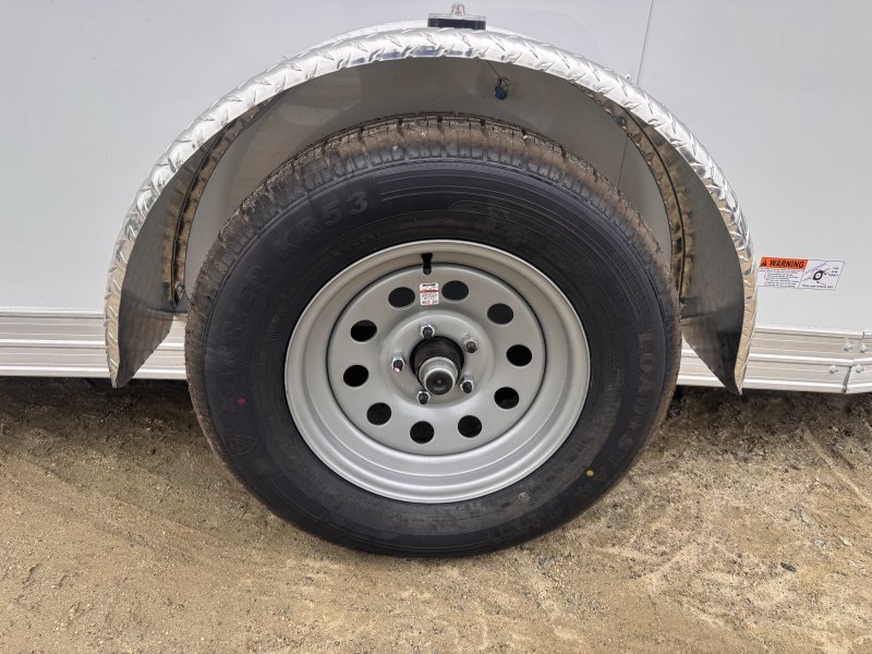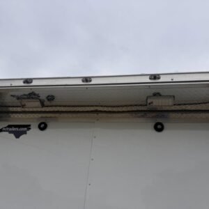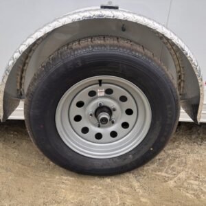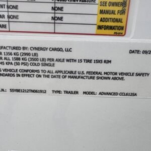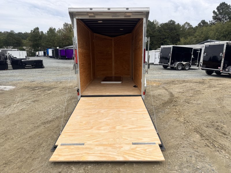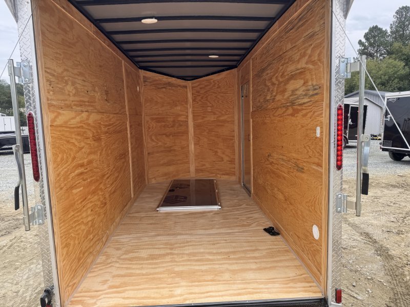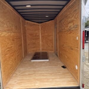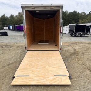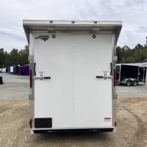 “This v-nose 6×12 enclosed cargo trailer has a single non-braking idler axle with a rating of 2,990 lb GVWR. This Pro Series model has a side door, a rear extended ramp door, 0.080″” polycore sides, 7′ interior height, a slant v-nose, rear wing with LED lights, and a 2000 lb jack.