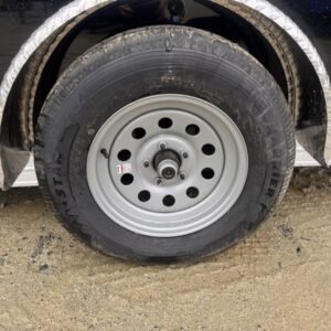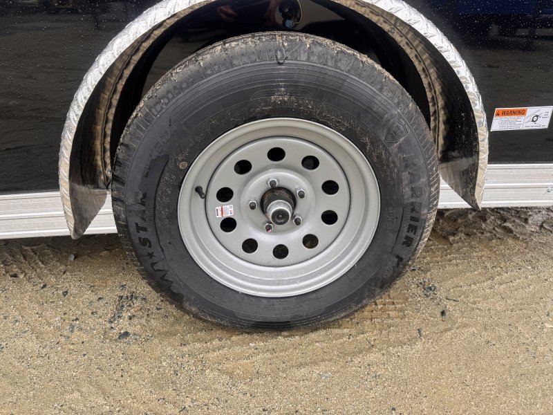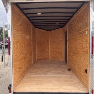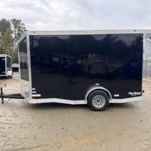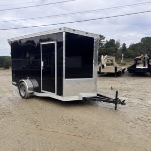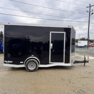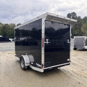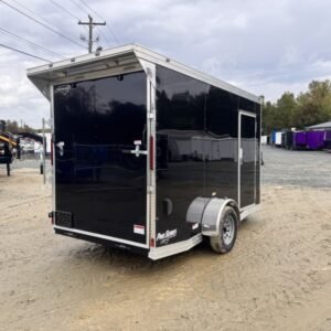 “This v-nose 6×12 enclosed cargo trailer has a single non-braking idler axle with a rating of 2,990 lb GVWR. This Pro Series model has a side door, a rear extended ramp door, 0.080″” polycore sides, 7′ interior height, a slant v-nose, rear wing with LED lights, and a 2000 lb jack.