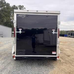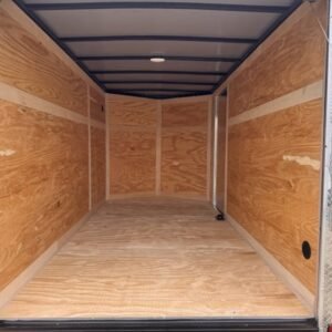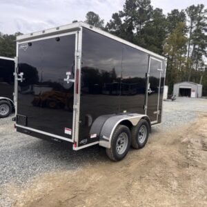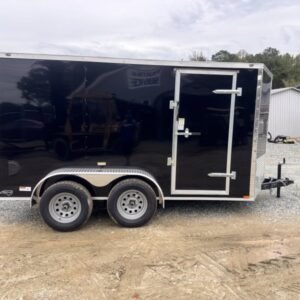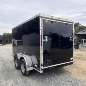 “This v-nose 6×12 enclosed cargo trailer has 6’3″” interior height, a tandem braking axle with a rating of 7,000 lb GVWR. This type of trailer is ideal for light-duty or residential tasks. This model has a side door, a rear ramp door, and a 2000 lb jack.