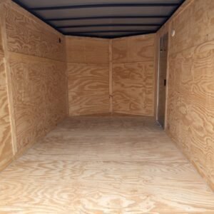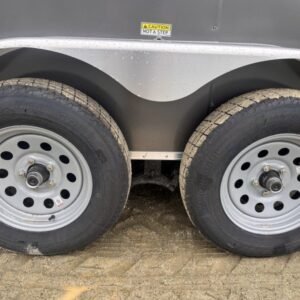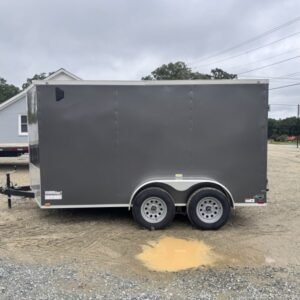 “This v-nose 7×12 enclosed cargo trailer has 6’3″” interior height, a tandem braking axle with a rating of 7,000 lb GVWR. This type of trailer is ideal for light-duty or residential tasks. This model has a side door, rear Barn Doors, and a 2000 lb jack.