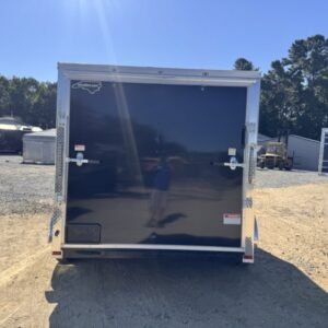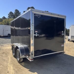 “This v-nose 7×12 enclosed cargo trailer has 6’3″” interior height, a tandem braking axle with a rating of 7,000 lb GVWR. This type of trailer is ideal for light-duty or residential tasks. This model has a side door, a rear ramp door, Polycore exterior siding and a 2000 lb jack.