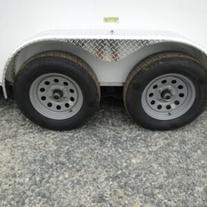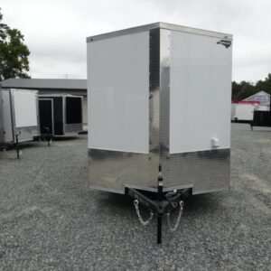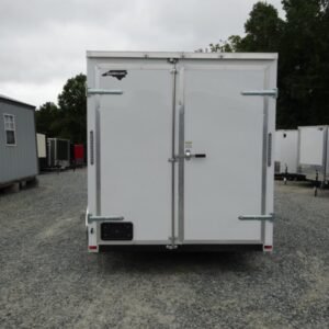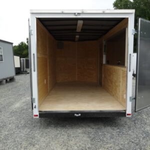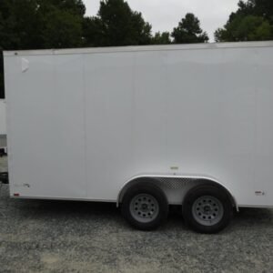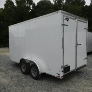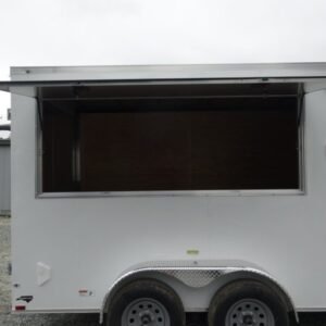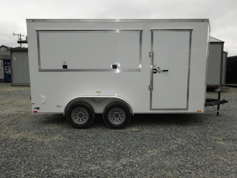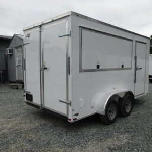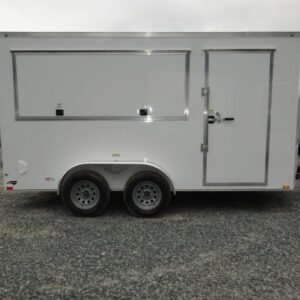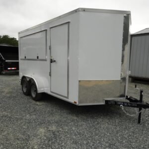 “This v-nose 7×14 enclosed cargo trailer has a 7′ interior height, tandem axles with brakes with a rating of 7,000 lb GVWR. This model has a side door, a rear barn door, 3×8 concession window, is braced and wired for A/C, 50 amp electrical package, 50 amp motor base plug, MC cable, and a 2000 lb jack.