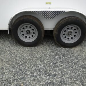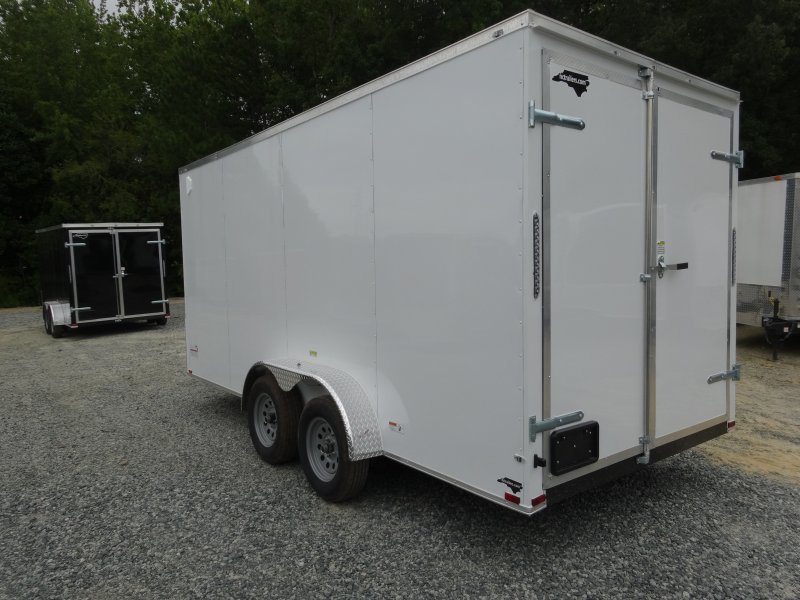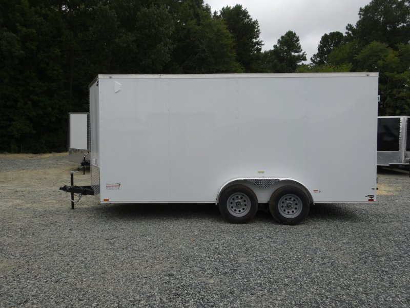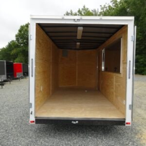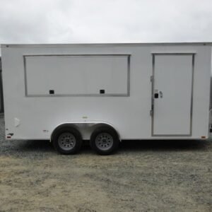 “This v-nose 7×16 enclosed cargo trailer has a 7′ interior height, tandem axles with brakes with a rating of 7,000 lb GVWR. This model has a side door, a rear barn door, 3×8 concession window, is braced and wired for A/C, 50 amp electrical package, and a 2000 lb jack.