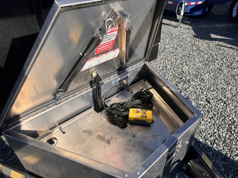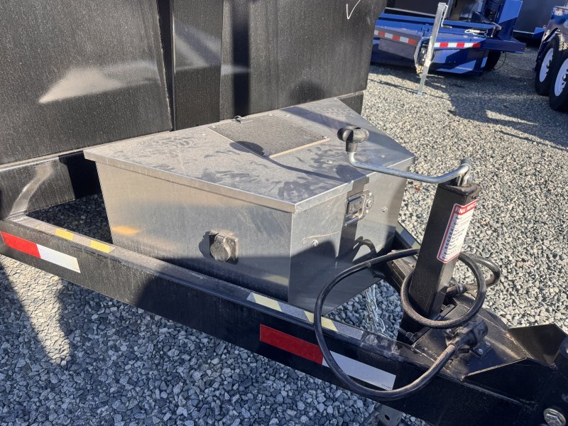 “This standard dump trailer has low profile 24″” sides. This unit has a double eye spring suspension, pump with deep cycle battery inside lockable security box, and a 20′ wired hand remote.