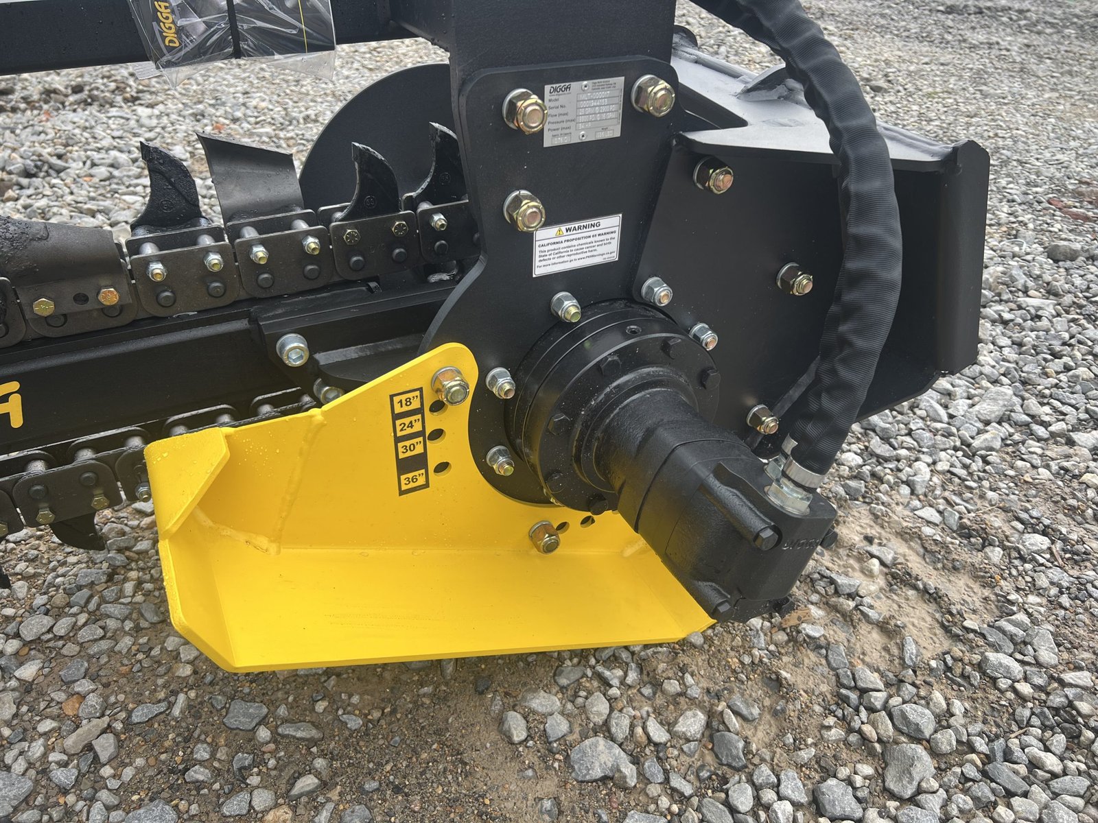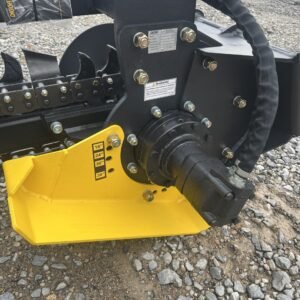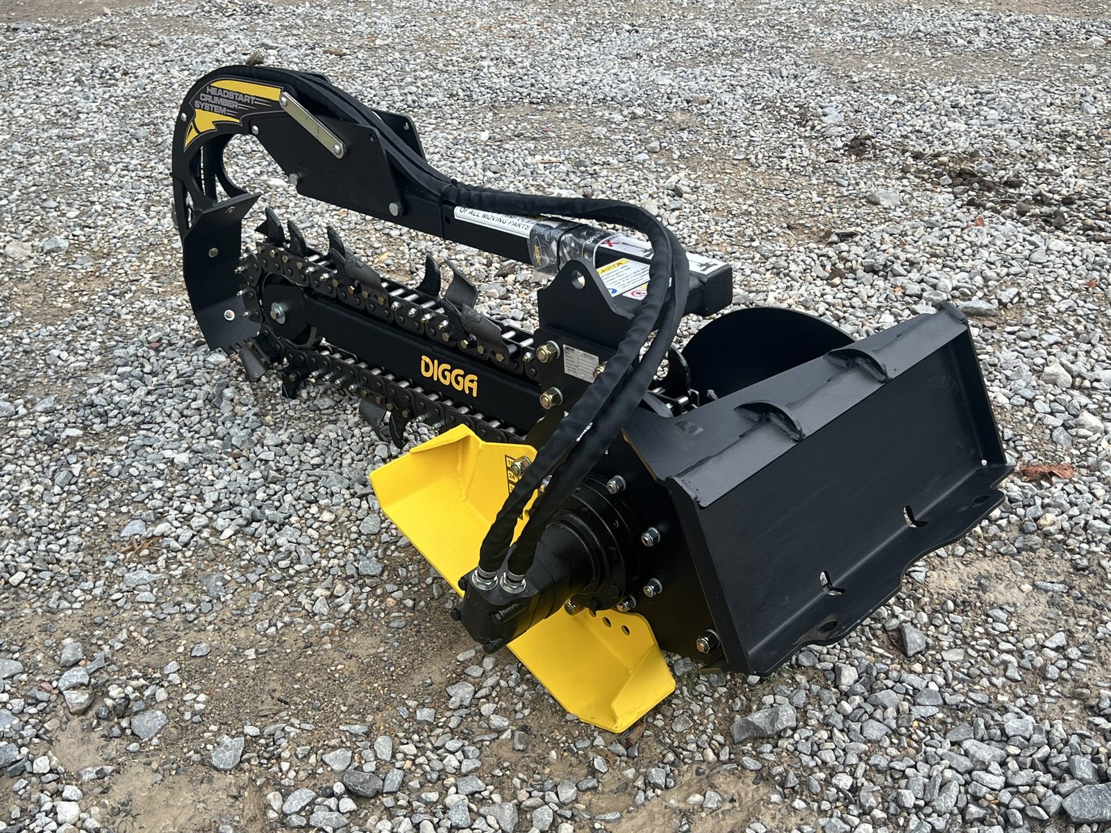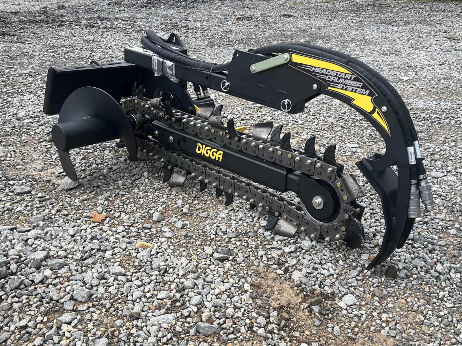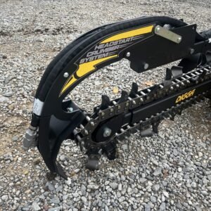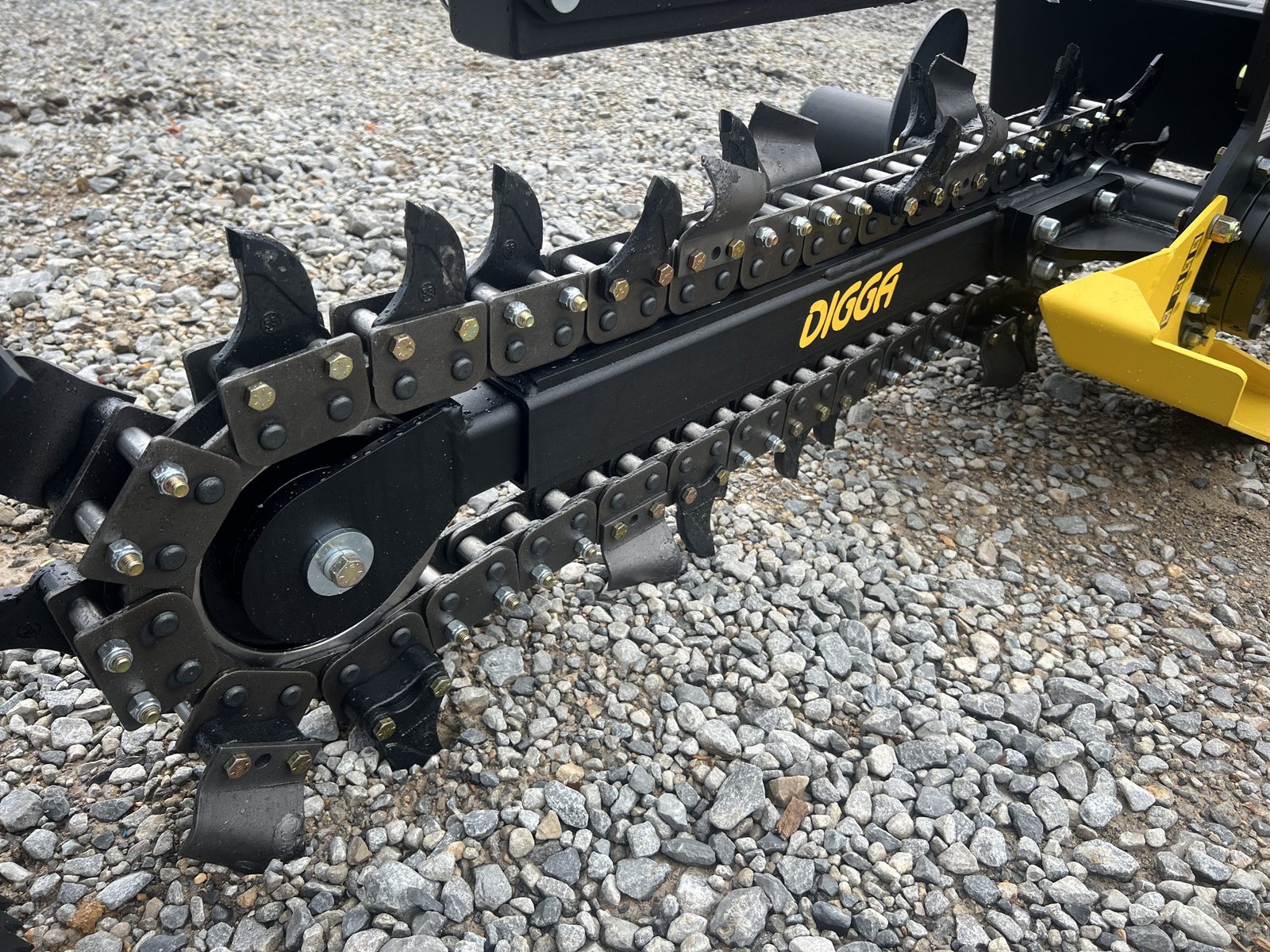 Equipped with Digga’s Combination Chain configuration (cup teeth and tungsten shark teeth), it is suitable for most applications. Will cut through hard soil, roots, soft shale, and rocky conditions. The adjustable depth control foot ensures precise trench depth every time, while the patent-pending crumber bar starts in the trench—eliminating the need for manual resets.