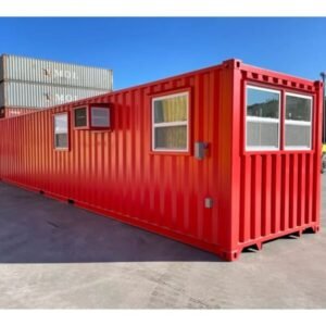 This 40FT modified shipping container office offers 800 sq ft of functional space, perfect for commercial or industrial use. It features a bold red exterior and includes a bathroom, storage space, and a skylight for natural lighting.
