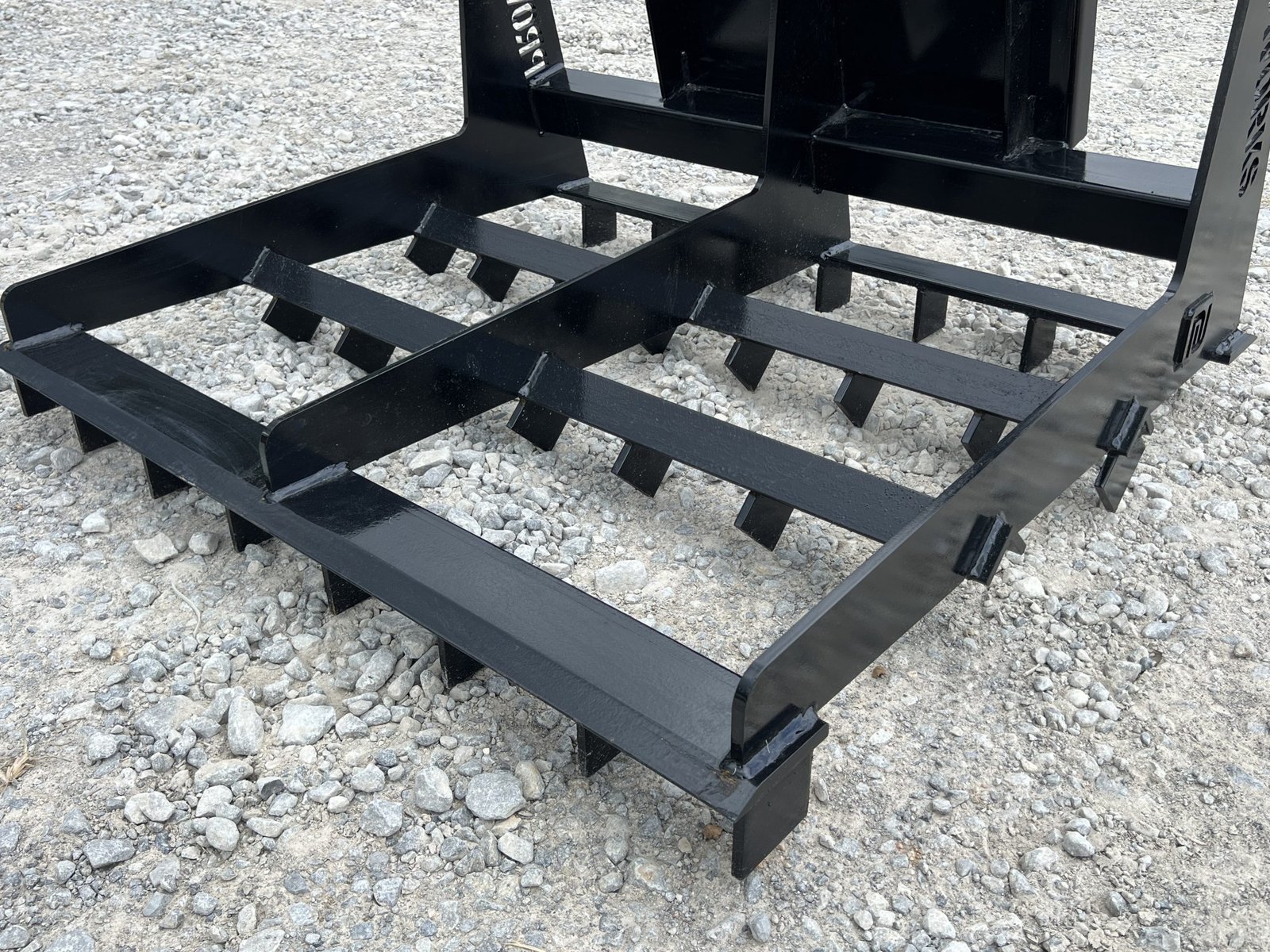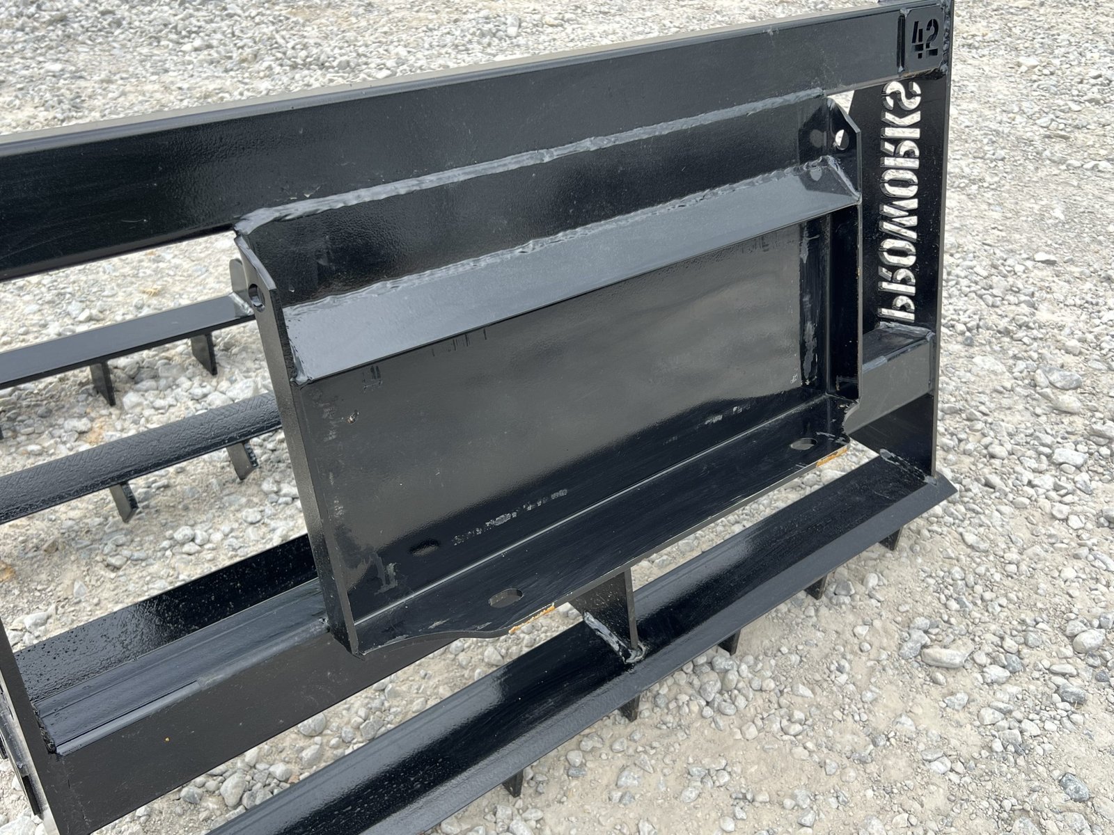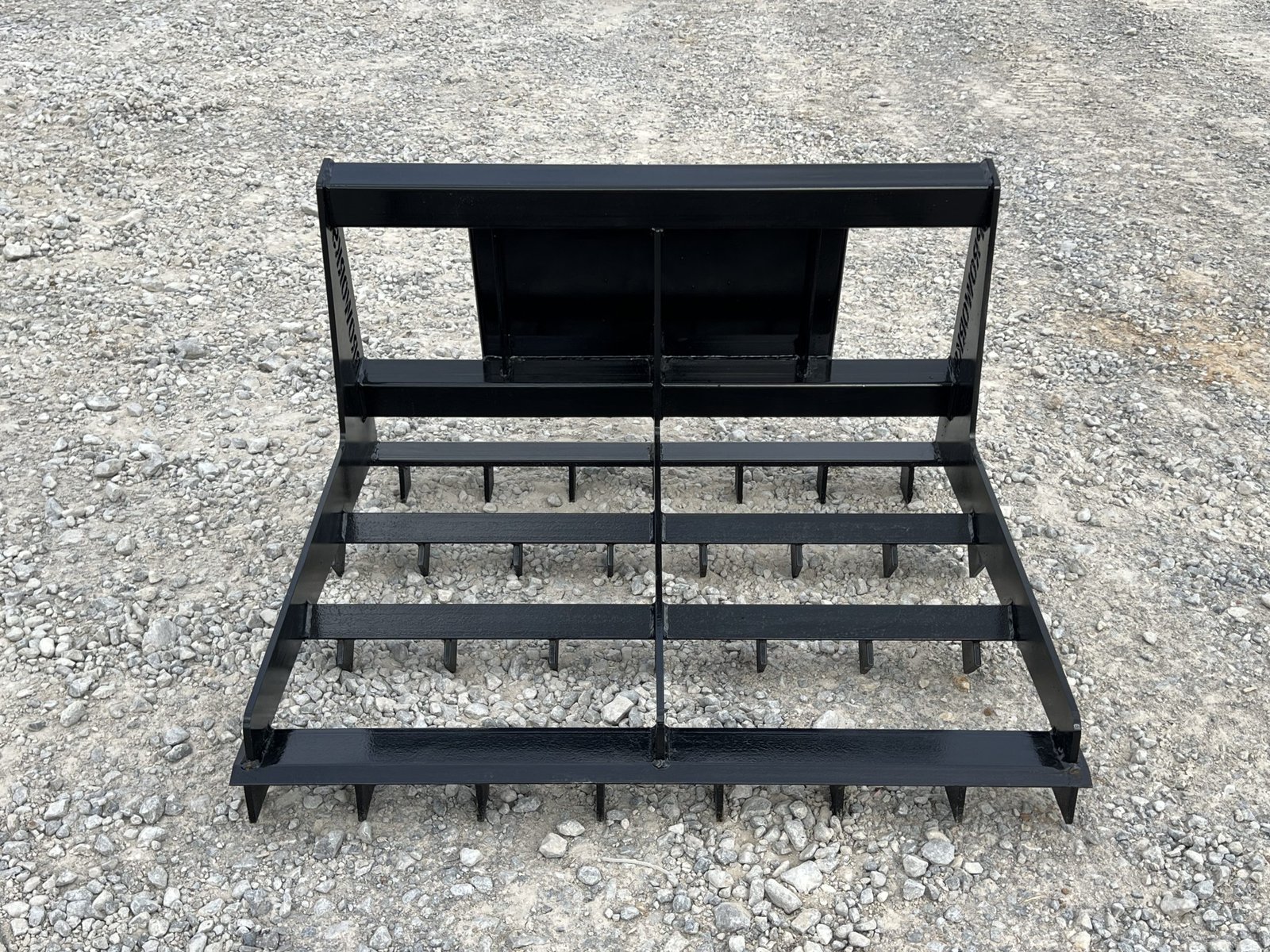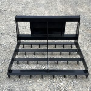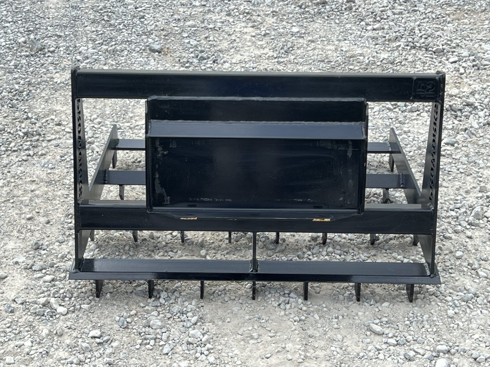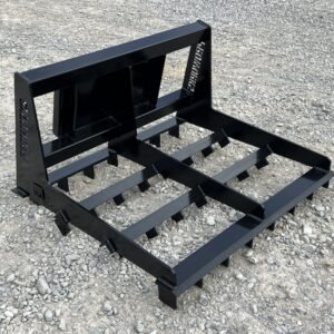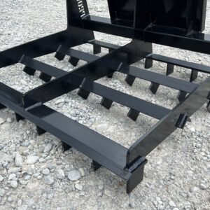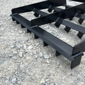 This is a brand new 42″ wide heavy duty land leveler attachment for a mini skid steer loader. The land plane attachment is great for quick and accurate grading. Unit has cutting edges, both front and back, allowing cutting hard surfaces and heavy angled tines in between to sift and spread dirt or gravel to low areas. The addition of the scarifier teeth allows for even better break up of hardened and compacted dirt.This mini universal mounting system is designed to fit the Toro Dingo, Vermeer, Ditch Witch, Finn, Ramrod, Boxer, Thomas and many more machines.