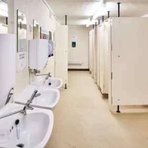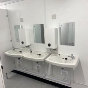 The 6-1 Steel Toilet Cabin features anti-vandal steel construction, 6 WC cubicles plus 1 accessible, basins, urinals, and heaters. Durable, insulated, and perfect for construction sites or outdoor events in the USA.