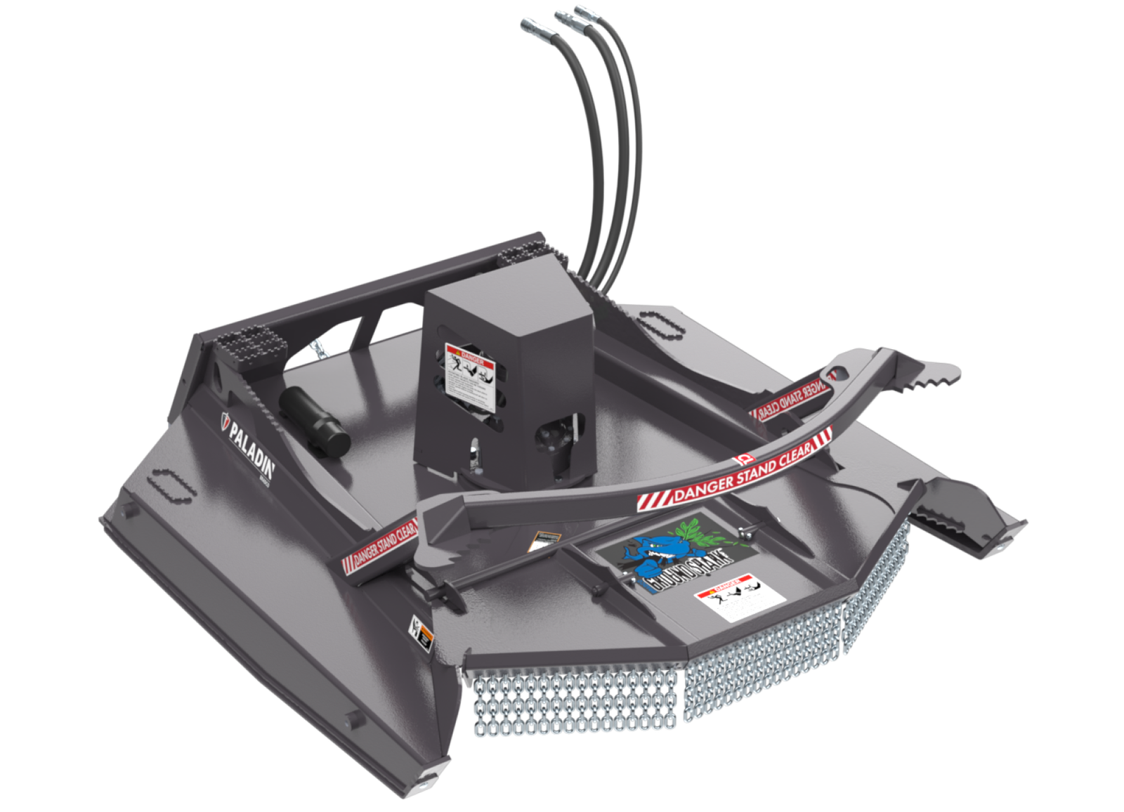 The 72″ wide Ground Shark extreme duty high flow brush cutter is designed for clearing medium to heavy density brush and hardwoods up to 10″ in diameter from wooded acreages, road right-of-ways, and pipeline maintenance. When the exclusive, patented retractable forward shield comes in contact with a tree, it moves up and back to expose the entire cutting edge of each blade while protecting the operator from flying debris.