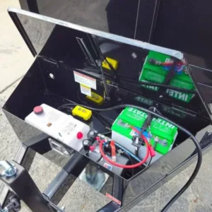 The battery is an Interstate deep cycle marine battery, ensuring a dependable power supply for the trailer’s hydraulic system.