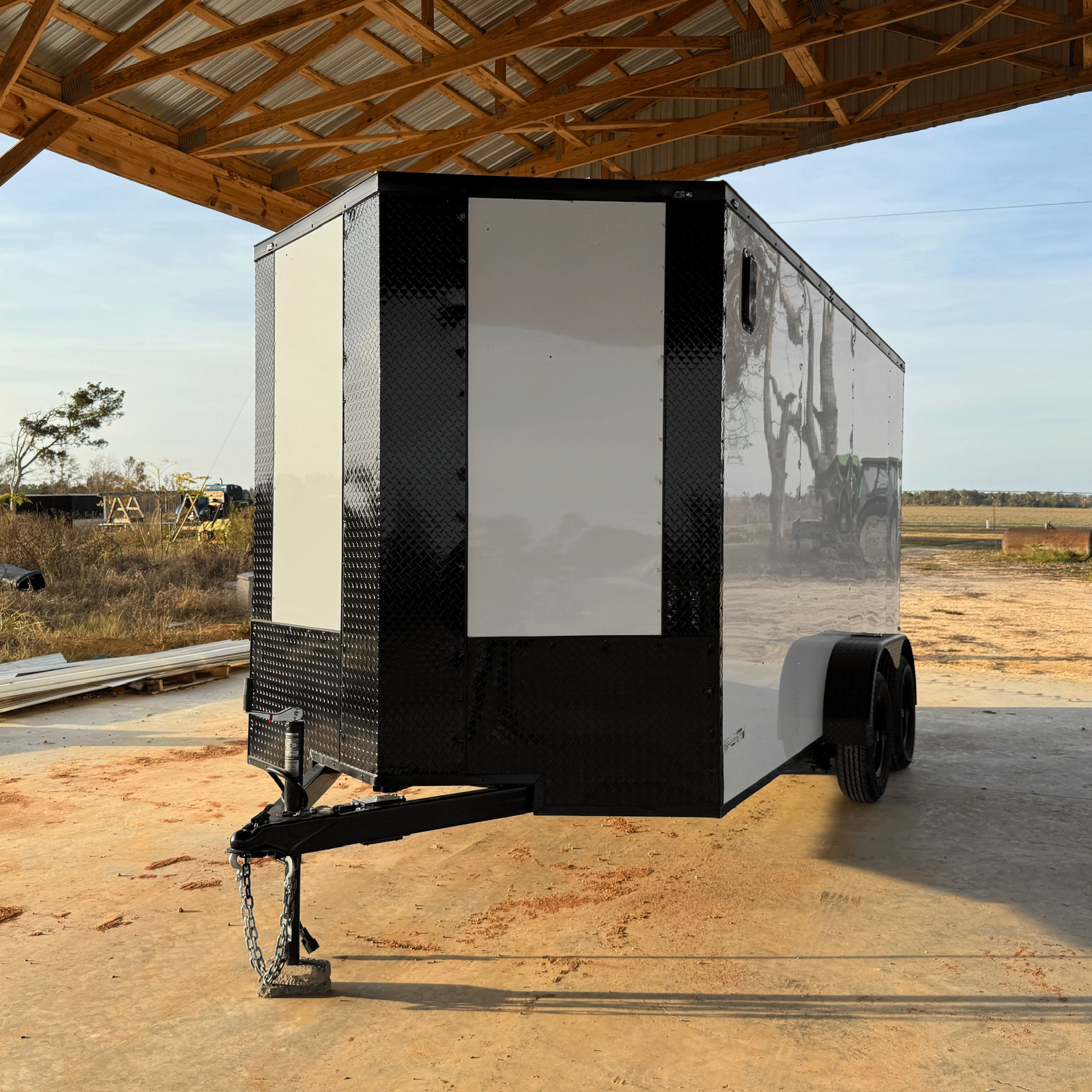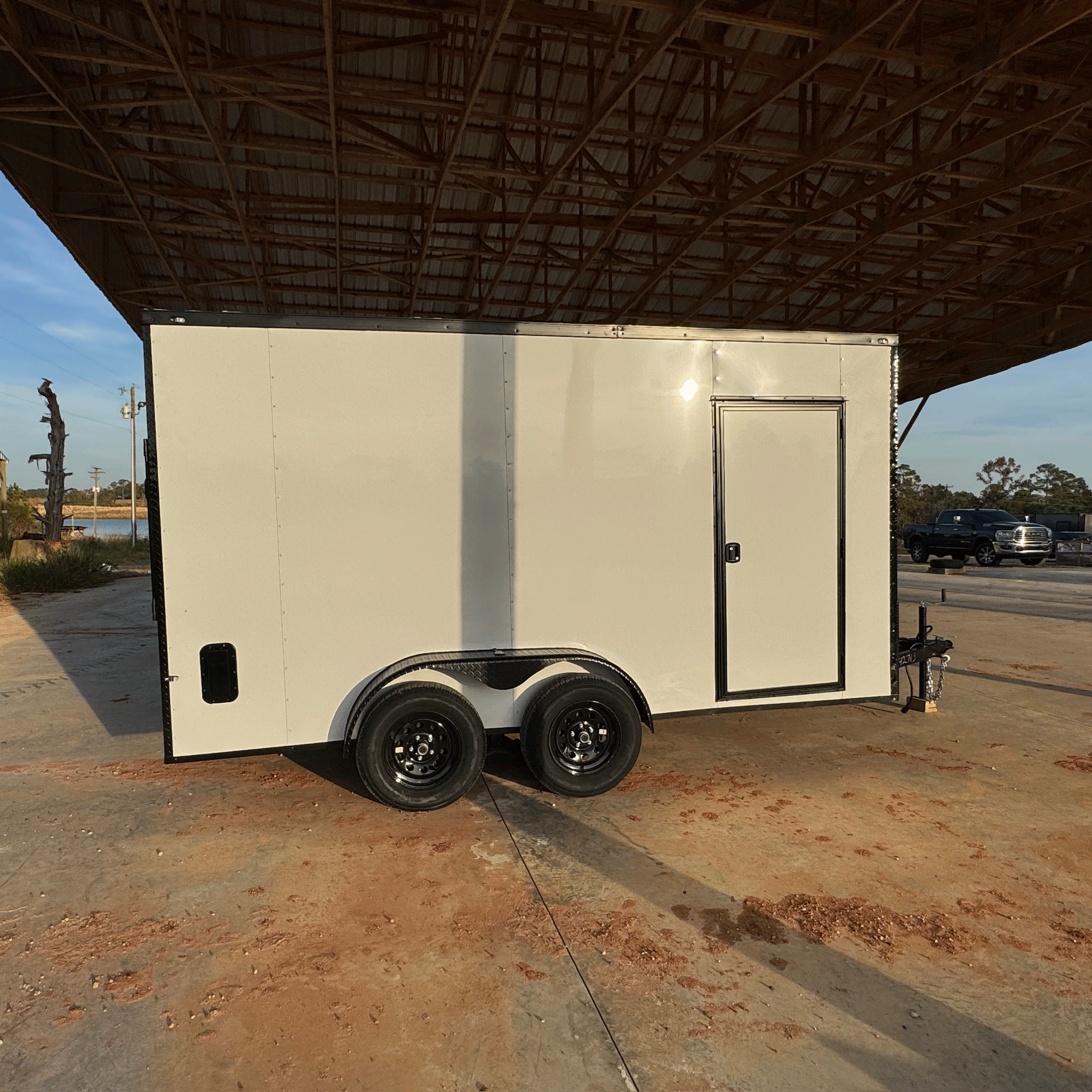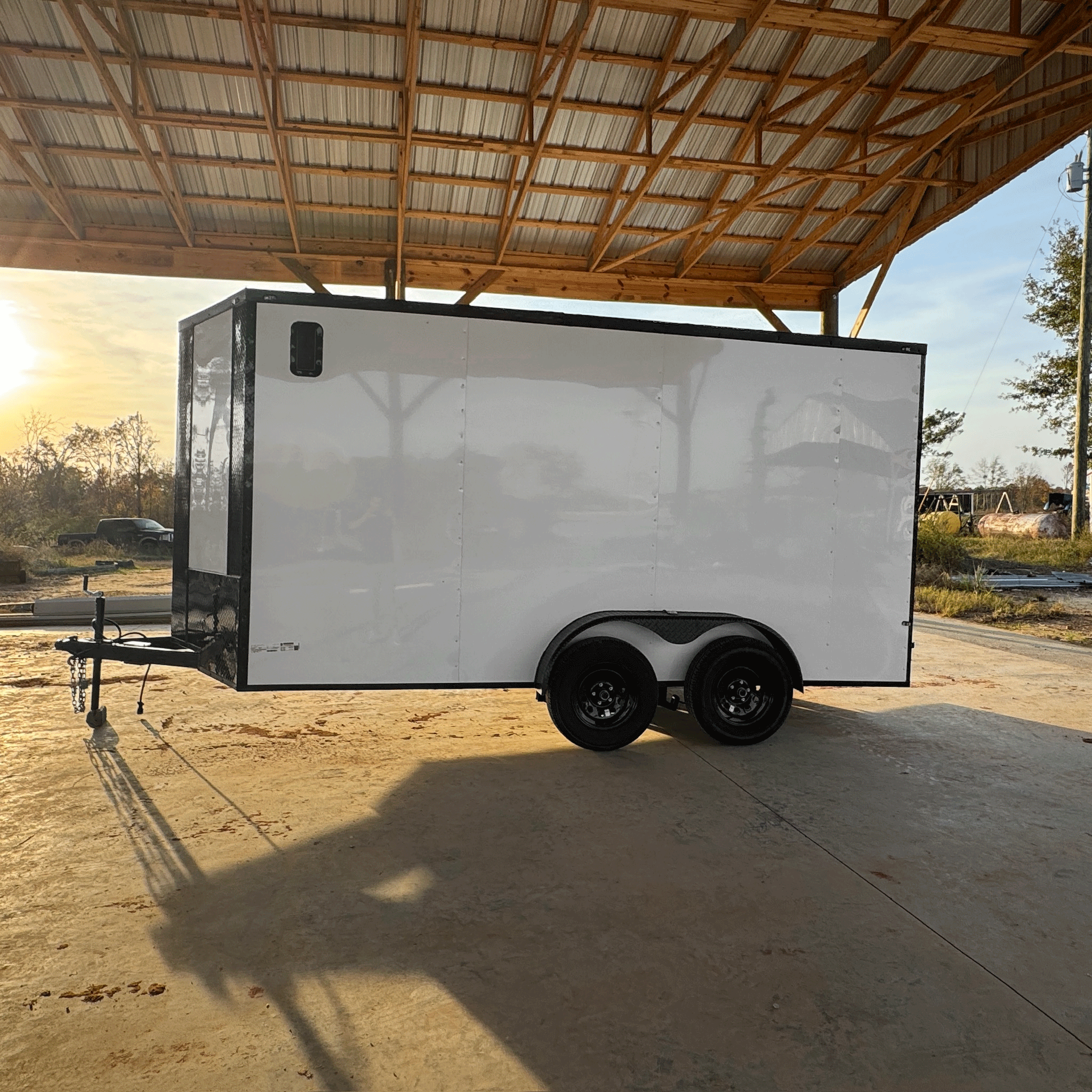 This 7×14 Tandem Axle White Blackout Enclosed Cargo Trailer delivers durability, clean styling, and reliable performance. Built with .080 Polycore panels, a semi-screwless exterior, and a 2×4 main frame, it offers a strong, modern look with its all-white body and aggressive blackout trim.