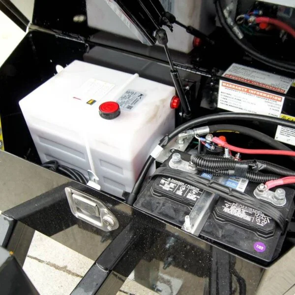The battery is an Interstate deep cycle marine battery, providing a dependable power supply for the trailer’s hydraulic system.