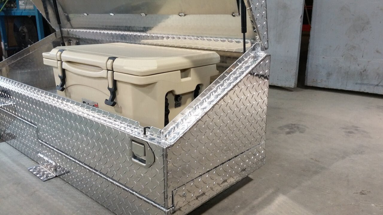 The tank is designed to provide enough space to fit a Grizzly 45 or Yeti 45 cooler directly inside the toolbox.