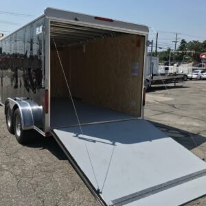 VIN 5A3C714D1TL000157 7×14 Car Mate Custom Cargo Enclosed Cargo Trailer 6″up Features: CarMate Trailer – CM714CC-HD Custom Cargo Trailer Flat Front .032 One Piece Aluminum Roof (LIFETIME ) 14ft Long 7ft Wide Steel Frame Epoxy Ester Alkyd Primer Catalyzed Paint that Dries Faster, Harder & Shinier Finish High Performance Urethane Paint Coating that is Resistant to Chipping. 2,000lb Top Crank A-Frame Jack Sand Pad 2 5/16in 10,000lb Coupler C-Channel Crossemembers Crossmembers 24in On Center 2in x 4in Tube Main Rails Tube Aluminum Roof Bows Roof Bows 24in On Center 1/4″ Safety Chains with 1/4″ Slip Hook 72″ Interior Height Vertical Posts 16in On Center Standard A-Frame Tongue 4in Drop Arm Tandem Axle Standard Track Electric Brakes 5 Bolt Pattern EZ Lube Hubs 1/2in Studs Torsion Suspension 3,500lb Axle 7,000 GVWR ST205/75R15C Radial 5B White Spoke Wheel Goodyear Radial Marathon Tires Max Size Rear Ramp Door – Standard Duty 36″W Side Man Door 3/4in Plywood Decking (LIFETIME ) 1/4″ Plywood Interior Sidewall 12v Dome Lights All LED Lights Inside and Out (LIFETIME ) .030 Aluminum Exterior Screwless Exterior 24in Stoneguard Sidewall Flow-Thru Vents Options: Screwless Exterior 6’6″ Interior Height 16″ OC Crossmembers on floor 2 Dome Lights Wall Switch 2 Wall Vents Rear Ramp Door with Dual Spring Assist