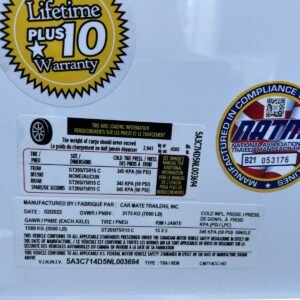 VIN 5A3C714D5SL002024 7×14 Car Mate Custom Cargo Enclosed Cargo Trailer Features: CarMate Trailer – CM714CC-HD Custom Cargo Trailer Flat Front .032 One Piece Aluminum Roof (LIFETIME ) 14ft Long 7ft Wide Steel Frame Epoxy Ester Alkyd Primer Catalyzed Paint that Dries Faster, Harder & Shinier Finish High Performance Urethane Paint Coating that is Resistant to Chipping. 2,000lb Top Crank A-Frame Jack Sand Pad 2 5/16in 10,000lb Coupler C-Channel Crossemembers Crossmembers 24in On Center 2in x 4in Tube Main Rails Tube Aluminum Roof Bows Roof Bows 24in On Center 1/4″ Safety Chains with 1/4″ Slip Hook 72″ Interior Height Vertical Posts 16in On Center Standard A-Frame Tongue 4in Drop Arm Tandem Axle Standard Track Electric Brakes 5 Bolt Pattern EZ Lube Hubs 1/2in Studs Torsion Suspension 3,500lb Axle 7,000 GVWR ST205/75R15C Radial 5B White Spoke Wheel Goodyear Radial Marathon Tires Max Size Rear Ramp Door – Standard Duty 36″W Side Man Door 3/4in Plywood Decking (LIFETIME ) 1/4″ Plywood Interior Sidewall 12v Dome Lights All LED Lights Inside and Out (LIFETIME ) .030 Aluminum Exterior Screwless Exterior 24in Stoneguard Sidewall Flow-Thru Vents Options: Screwless Exterior 6’6″ Interior Height 16″ OC Crossmembers on floor 2 Dome Lights Wall Switch 2 Wall Vents Rear Ramp Door with Dual Spring Assist