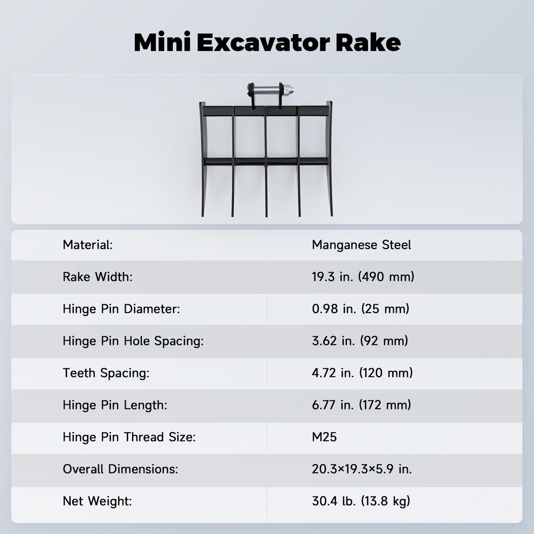 Upgrade your mini excavator with the Williams Tractors Mini Excavator Rake Attachment 19.3″, an essential tool for efficient debris removal and soil preparation around your property. Designed with precise dimensions, this rake attachment ensures reliable compatibility with Williams Tractors mini excavators and most other models up to 2.5 tons. It includes two hinge pins and nuts for fast, easy installation helping reduce downtime and keep your projects moving. Constructed from heavy-duty manganese steel, this attachment offers excellent wear and corrosion resistance for dependable performance in demanding conditions. Whether for agriculture, construction, landscaping, or general land clearing, this mini excavator rake enhances productivity and helps you complete jobs faster and more efficiently.