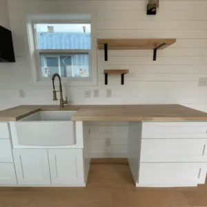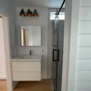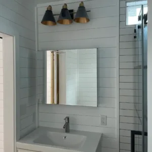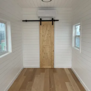 Framing & Walls 2×4 wood studs at 16″ centers with white shiplap interiors