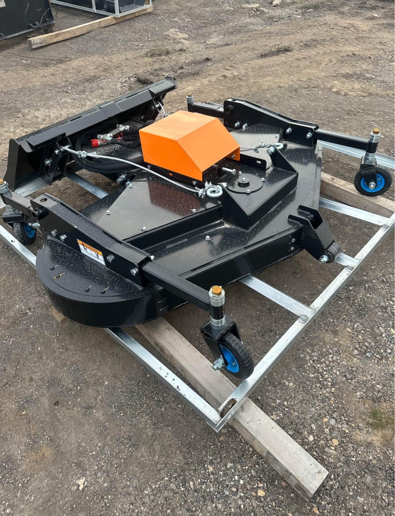 The Finish Mower achieves a perfectly cut lawn, allowing you to mow close to shrubs and buildings for faster yard maintenance. Powered by a direct-drive hydraulic motor, this front-mounted universal Skid Steer carrier is built with a floating mount plate enabling the unit to contour to your lawn for an even cut no matter the terrain. The three overlapping blades discharge cut material under the carrier and rear. Combined with the attachment frame, the adjustable wheel brackets provide a better floating deck to follow uneven terrain and can be set from 0.4″- 3.2″
